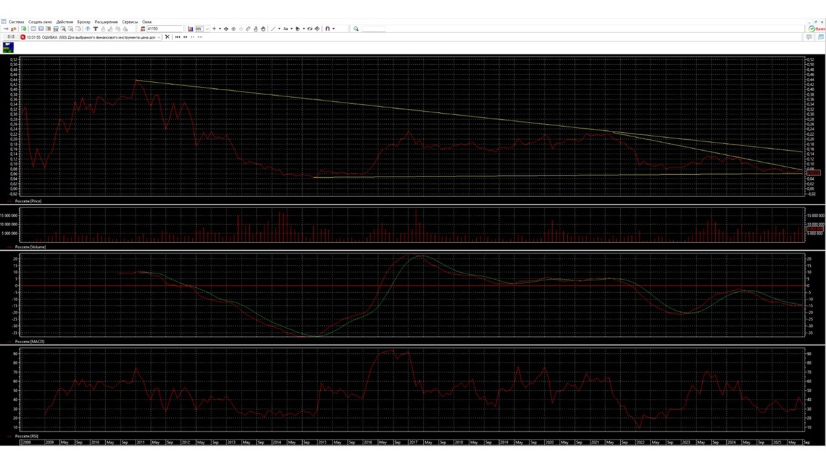 3. Новостной фон ухудшается, рубль практически достиг уровня 90, Центральный банк РФ отказался в октябре понижать ставку до 16%. Компания ФСК-Россети сообщает инвесторам, что завершение реконструкции энергетической сети откладывается до апреля 2026 года. Акция к середине октября практически достигает уровня 0,062, к концу октября находится под уровнем 0,062. К середине ноября приближается к уровню 0,06.