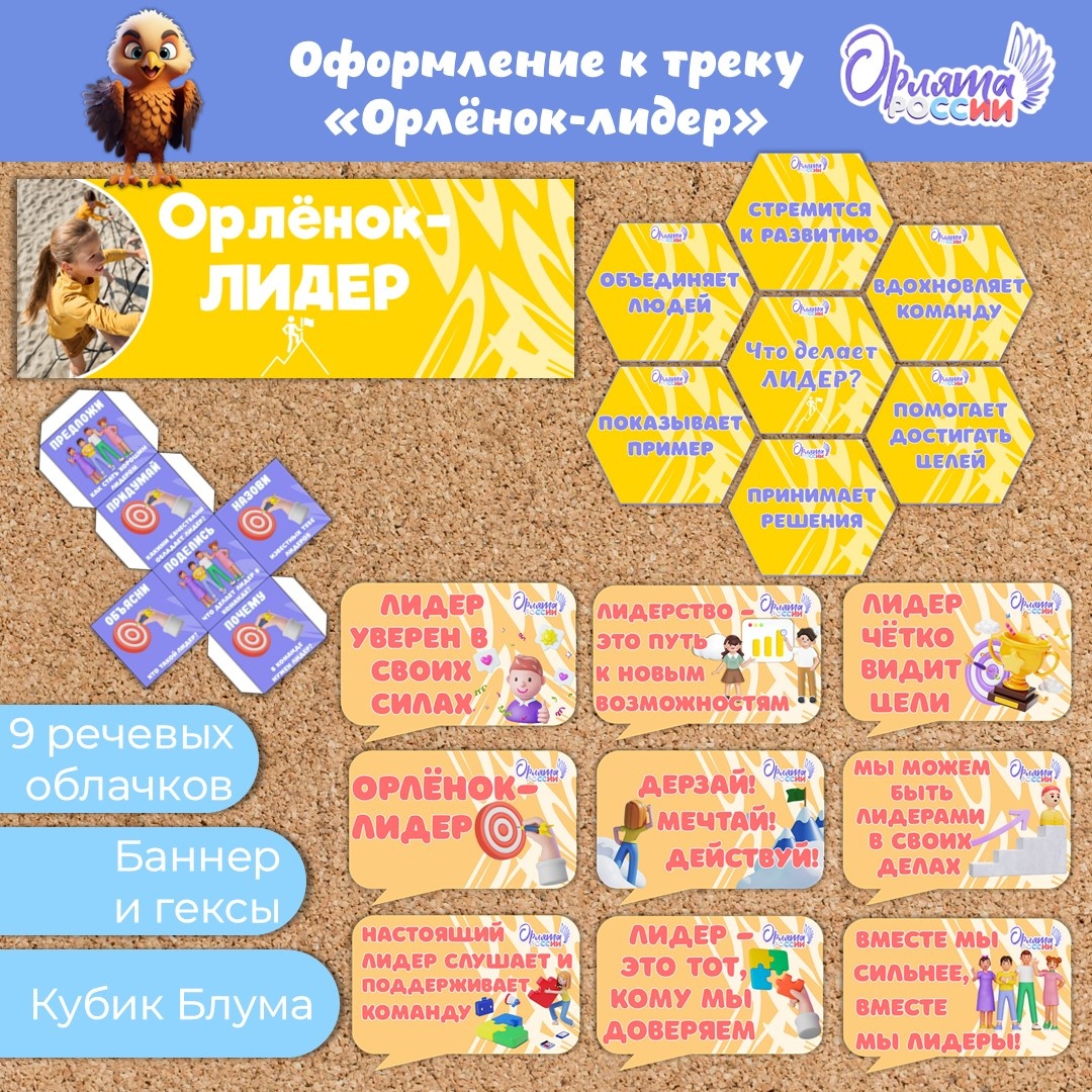 Оформление к внеурочной деятельности «Орлята России». Трек «Орлёнок-лидер». В набор для оформления входит: Оформление - эффективный инструмент для создания яркого, информативного и мотивирующего пространства в классе. Оформление представлено в фирменном стиле общественного движения школьников Орлята России. Файл в PDF-формате на листах А4. В процессе печати можно настроить необходимый размер материалов. Материалы к треку "Орленок-лидер": Другие материалы на тему "Орлята России" можно посмотреть тут.