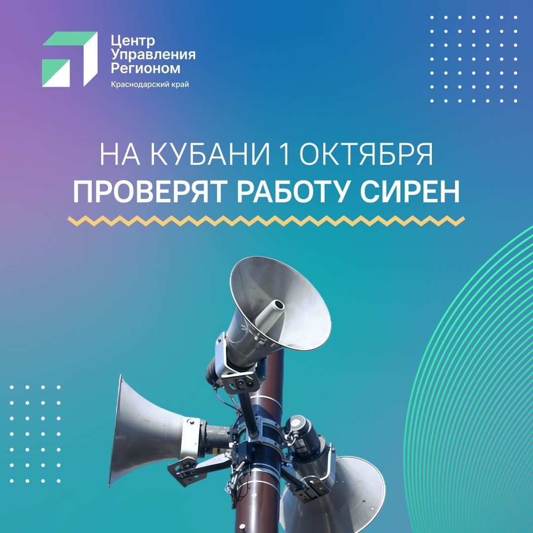 В Краснодарском крае 1 октября пройдёт плановая проверка систем оповещения населения. В этот день в 10:30 и 10:40 во всех муниципалитетах Кубани будут запущены сирены, предупреждающие об опасности. Жителей и гостей Краснодарского края просят сохранять спокойствие при появлении звука сирен. Проверка носит плановый характер, а все сигналы являются учебными.