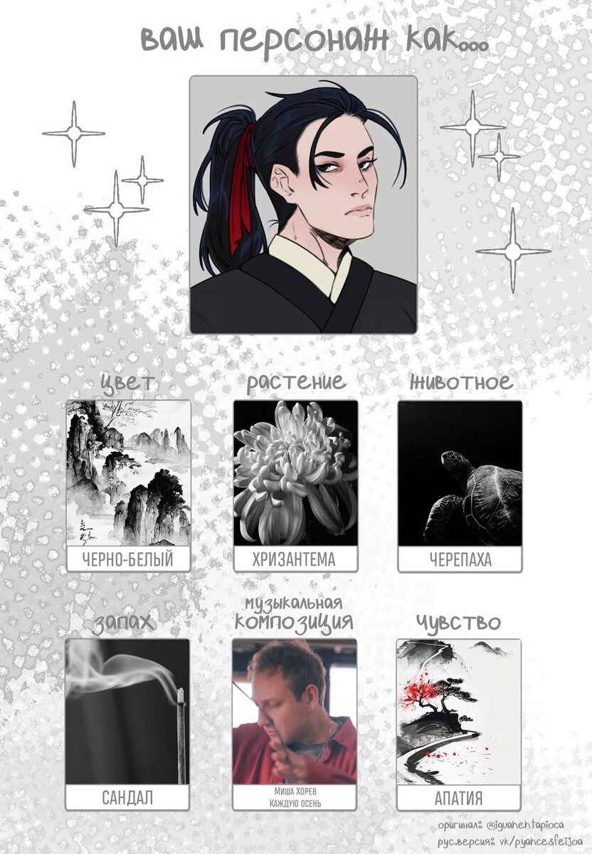 У нас новенький ивент, в рамках которого покажу вам арт кисти Гвена — это Мо Хэ, главный герой «В черной краске становишься черным», тот самый даос, до которого все решили докопаться внезапно. Мо Хэ, взявший себе имя «Безмолвное осуждение» — это квинтэссенция черного, белого и красного. Черного, как мрак в его душе, белого, как смерть (и хризантемы), и красного, как кровь, которой залиты его руки, кровь его жертвы и обещания. Мо Хэ очень любит осень, он меланхоличный, и живи он в современности, ему бы диагностировали тяжелую депрессию 😩 Кто бы мог подумать, что величайший заклинатель эпохи так мрачен? Хорошо, что у него есть Гу Вэньвэнь, его ученица, чтобы разгонять мрак его души! Ну и вообще, чернуха — все еще веселая история 😠 И проклятой черепахой его зовет один небезызвестный демон 🥺 #Чернильные_строки #шаисы_чернуха
