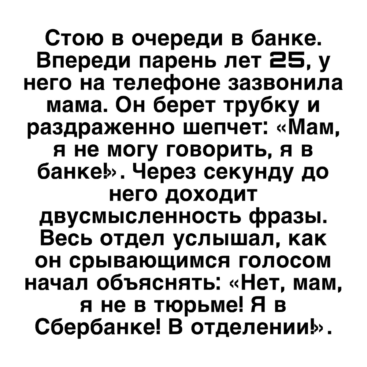 --- 1. «Позвони маме» Стою в очереди в банке. Впереди парень лет 25, у него на телефоне зазвонила мама. Он берет трубку и раздраженно шепчет: «Мам, я не могу говорить, я в банке!». Через секунду до него доходит двусмысленность фразы. Весь отдел услышал, как он срывающимся голосом начал объяснять: «Нет, мам, я не в тюрьме! Я в Сбербанке! В отделении!». 2. Автомат с кофе Коллега решил сэкономить и купил самый дешевый кофе из автомата. Нажал кнопку, аппарат загрохотал, а вместо кофе выдал ему… пустой стаканчик и чек с надписью «Спасибо за покупку!». Он так растерялся, что отнес чек в бухгалтерию и спросил, можно ли его учесть как производственные расходы. 3. «Тот самый парень» Поехал в гости в другой город. Зашел в магазин, а на кассе стоит мой старый знакомый, которого не видел лет 10. Обрадовались, начали болтать. Вдруг кассирша протягивает ему чек и говорит: «С вас 857 рублей». А он, не прерывая разговора, поворачивается ко мне и спрашивает: «Слушай, а ты не одолжишь?». Пришло