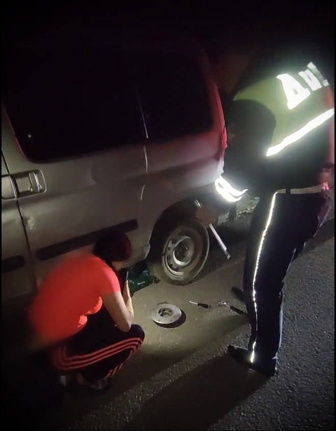 Подъехав к месту, сотрудники полиции увидели, что девушка-водитель пытается заменить проколотое заднее левое колесо, но из-за недостатка опыта у неё это не получается.
