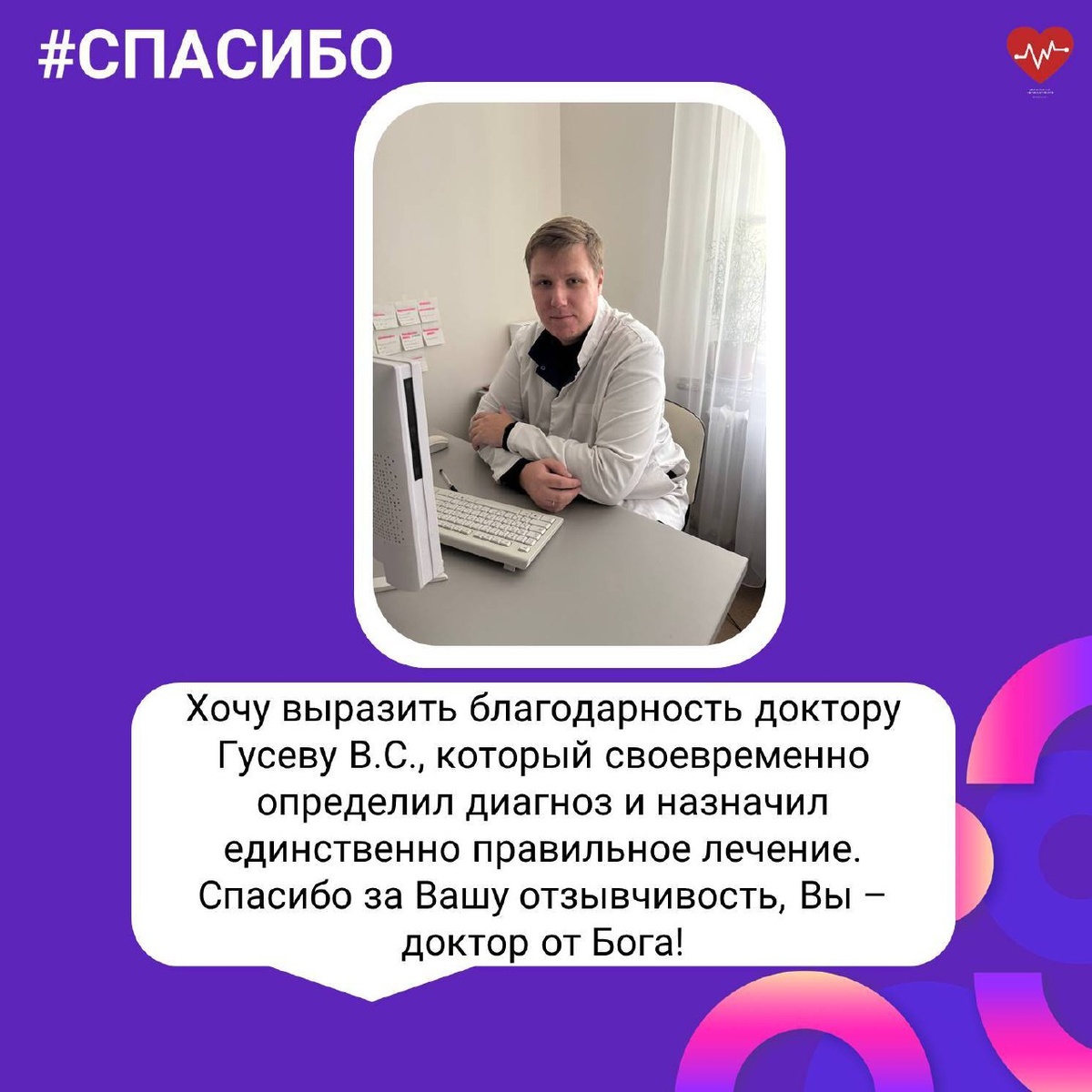 Продолжаем публиковать благодарности, которые мы получаем от пациентов. На этой неделе размещаем благодарность врачу Гусеву Вадиму Сергеевичу, врачу – терапевту Калужской городской клинической больницы № 4 им. А. С. Хлюстина. Оставить благодарность медикам можно сканируя QR-код с помощью камеры вашего смартфона. Коды находятся на кабинетах врачей в поликлиниках и стационарах.