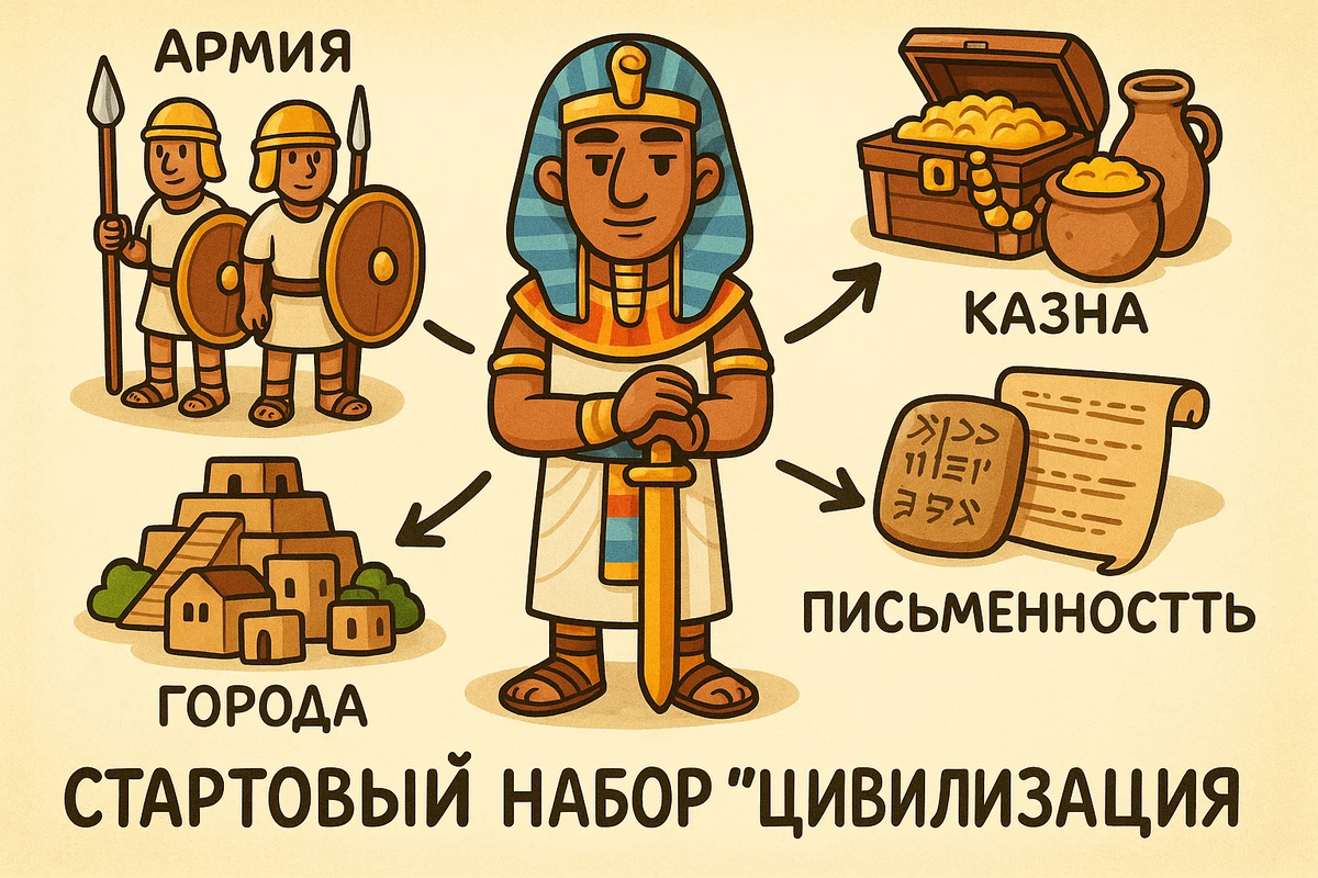 Более 5 тысяч лет назад человечество совершило огромный скачок. На смену племенам пришли первые государства или цивилизации. Это как перейти из маленькой деревни в огромный мегаполис. Что было в "стартовом наборе" любого древнего государства? Первые такие супер-государства появились там, где было крутое земледелие — у больших и полноводных рек. И самое известное из них — Древний Египет. Египет находится в Северо-Восточной Африке. Почти вся его территория — это безжизненная пустыня. Но через всю эту пустыню течет одна из величайших рек мира — Нил. Нил был для египтян всем: По сути, вся страна Древний Египет — это узкая зеленая долина Нила, зажатая между двумя пустынями. Где Нил — там жизнь. Где его нет — там только песок. В Египте почти никогда не бывает дождей. Откуда же вода для полей? Её приносил сам Нил! Каждый год в июне река выходила из берегов и затопляла всю долину. Это был не катаклизм, а настоящий праздник! Разлив Нила был для египтян как ежегодный сервис "всё включено": Благо