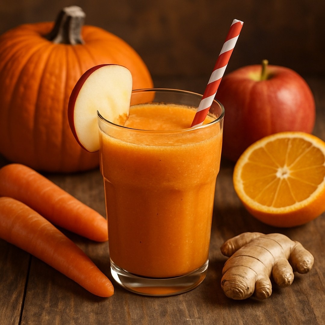 Осенний витаминный коктейль Ингредиенты ⤵️ 🔸 Тыква – 200 г 🔸 Яблоко – 1 шт. 🔸 Морковь – 1 шт. 🔸 Апельсин – 1 шт. 🔸 Имбирь свежий – 10 г 🔸 Мед – 2 ч.л. 🔸 Корица молотая – ¼ ч.л. 🔸 Вода питьевая – 100 мл 🔸 Лед – 5 кубиков Приготовление🍹 1. Тыкву нарезать кубиками, бланшировать 5-7 минут до мягкости. Остудить. 2. Яблоко и морковь очистить от кожуры, нарезать произвольными кусочками. 3. Апельсин очистить от цедры, разделить на дольки. 4. Имбирь очистить и натереть на мелкой терке. 5. Все ингредиенты поместить в блендер: тыкву, яблоко, морковь, апельсин, имбирь. 6. Добавить мед, корицу и воду. Взбить до однородной консистенции. 7. При желании добавить лед. Перелить в стакан, украсить долькой яблока. Рецепт дня #коктейль #витаминный_коктейль #овощи #фрукты #специи #напиток