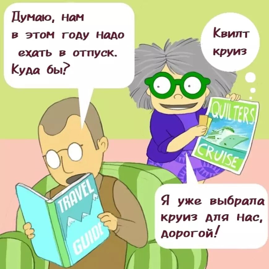 Продолжение истории про лоскутницу миссис Боббинс. Супруги решают ехать в отпуск вместе. Я перевела текст. Пробовала этот шрифт. А мужу чем заняться? — Да пусть лежит тюленем на палубе и расслабится ) — Вот это муж, соглашается плавать с женой в этом круизе! — Я не беру мужа на выставки и мероприятия по рукоделию. Чтобы не скучал на них. — Мечтаю о таком круизе) А так обычно еду на разные фестивали по ткачеству и прочему. — У них такие сильные ветры?? Лоскутная работа слишком тяжелая! — Да, смерчи бывают у них... Но не на корабле? — Купальники из лоскутков? На подкладке? И не эластичные? Такие бывают? — Если это не фантазия художницы, это могут быть эластичные купальники с лоскутным принтом фабричного производства. Как на этом фото. — И лоскутное полотенце добавьте)) — В принципе, можно сделать лоскутные края на полотенце. — Мне нравится этот купальник у миссис Боббинс. Это просто майка и трусы! — Все же это настоящий купальник из лоскутков... — Думаю, это преувеличение. Шутка. И рису