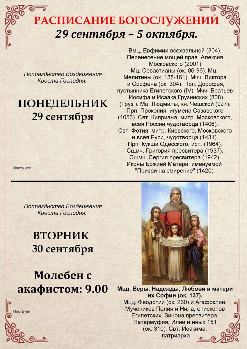 🌹🌿🌺 29 сентября – 5 октября🌺🌿🌹 💐ВТОРНИК 30 сентября - Мучениц Веры, Надежды, Любови и мате-ри их Софии. Молебен: 9.00 с акафистом. 🧹ЧЕТВЕРГ 2 октября 9:00 УБОРКА ХРАМА 💐ПЯТНИЦА 3 октября Вечернее богослужение: 16.00 💐СУББОТА 4 октября - Обретение мощей святителя Димитрия, митрополита Ростовского Литургия: 8.00 по окончании панихида Вечернее богослужение: 16.00 💐ВОСКРЕСЕНИЕ 5 октября - Пророка Ионы Акафист: 7.00 Молебен: 7.30 Литургия: 8.00 ✅ ПОДПИСАТЬСЯ l ПРИСЛАТЬ НОВОСТЬ