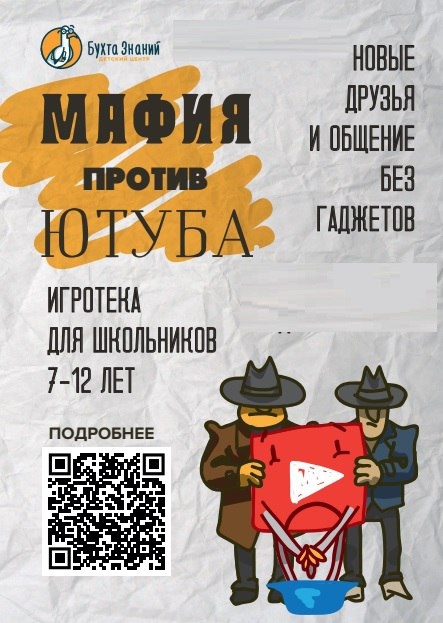 Что делать, если ребёнок целыми днями смотрит 📺 Ютуб или ТикТок, залипая в бесконечные ШОРТСЫ 🎥 и РИЛСЫ ? Отбирать телефон, не предложив ничего взамен - прямая дорога к семейным конфликтам 😔 У нас есть идея получше! Приводите ребёнка в “Бухта знаний” 🌍🚀 на игровые занятия “Мафия против Ютуба” 🧑🤝🧑 Вы сами любили играть в мафию в школе? Согласитесь, отличная игра, которая прекрасно развивает 🗣 коммуникабельность, ✅ стратегическое мышление, учит владеть собой, разговаривать с людьми, наблюдать за ними и считывать язык тела 🕵️♂️👁 В “Бухте” мафия ещё и проводится с разными модификациями: меняются персонажи, которые близки и понятны детям, меняются глобальные задания, и в целом поддерживается атмосфера интереса и вовлечённости 💃🏼😄 Кстати, родители тоже могут приходить и играть! Мы всех приглашаем! Так кто же победит в противостоянии “Мафия против Ютуба”? Запишитесь и узнаете! Ждем вас в вотсапе +7916446488 Мы выбираем будний день в 19 часов. Либо выходной стоимость и