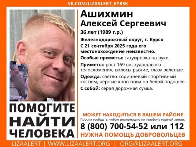 Пропал 36-летний курянин с татуировкой Курские поисковики отряда «ЛизаАлерт» обращаются за помощью к жителям. Нужно найти Ашихмина Алексея Сергеевича. Он ушел 21 сентября 2025 года, с тех пор о нем ничего неизвестно. Мужчине 36 лет. Он проживал в Железнодорожном округе Курска. Особая примета – татуировка на руке. Худощавый, волосы рыжие, глаза зеленого цвета. Был одет в светло-коричневый спортивный костюм и черные кроссовки. Имел при себе серую дорожную сумку