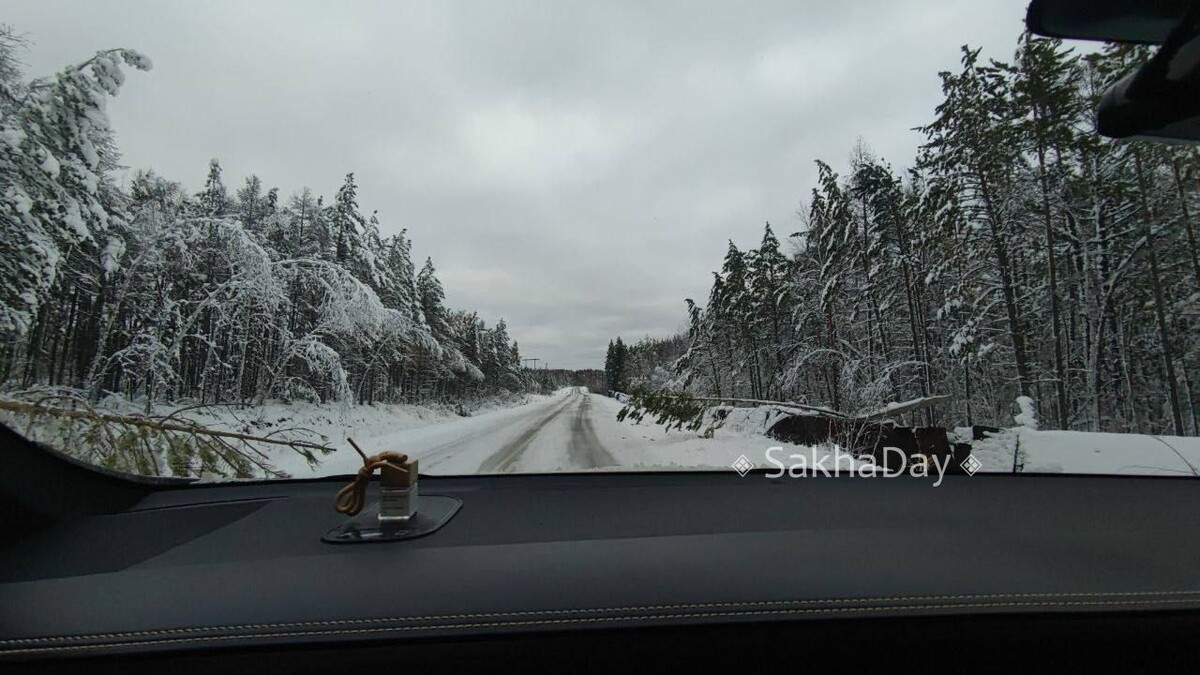 Трасса Умнас, между Булгунняхтахом и Верхним Бестяхом лежат деревья с 27.09. Фото сделано 28.09 в 13 час. дня. Опасная аварийная ситуация, сложно разъехаться, вся трасса -лед. SD Новости Якутии | Сообщить новость | ВК/MAX