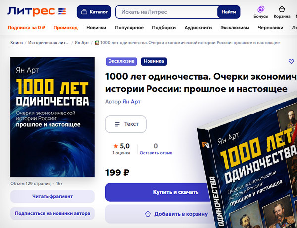 На сайте Литрес.ру открыта продажа электронного формата книги главного редактора Finversia Яна Арта «1000 лет одиночества».