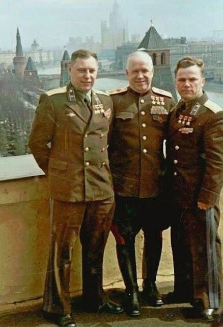 Трижды Герои Советского Союза (на тот момент), слева направо: маршал авиации Александр Покрышкин, маршал СССР Георгий Жуков и генерал-полковник авиации Иван Кожедуб. Москва. Кремль. 1949 год.