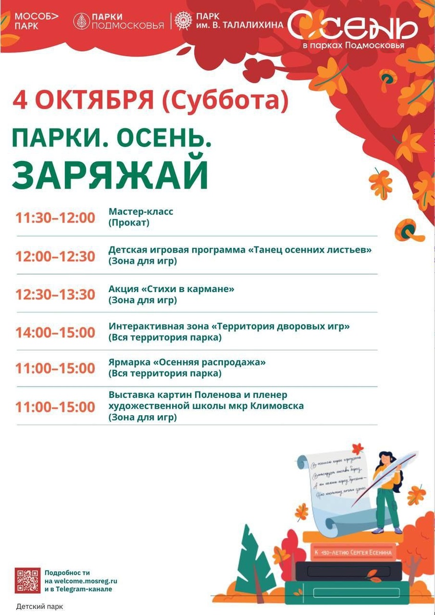 ✨ Расписание мероприятий на день города Подольска (4 октября) 🎨 11.30 - 12.00 Творческий мастер-класс 🎉 12.00 - 12.30 Детская игровая программа ✒️ 12.30 - 13.30 Стихотворный флешмоб ⛹️ 14.00 - 15.00 Подвижные игры 🧸 11.00 - 15.00 Ярмарка 🖼 11.00 - 15.00 Выставка картин Приходите 🧡 🚫 Возраст: 0+ 📆 04.10.2025 🏢 Детский парк культуры и отдыха 📍 г. Подольск, мкр. Климовск, ул. Заводская, 6а 💰 Вход свободный❗️ ⭐Поддержать канал голосом 💰 Вакансия - курьер в Подольске ✅ Мероприятия Подольск https://dzen.ru/id/66ed500f7b5671493eca3fd6 http://vk.com/podolsk_events http://dzen.ru/podolsk_events