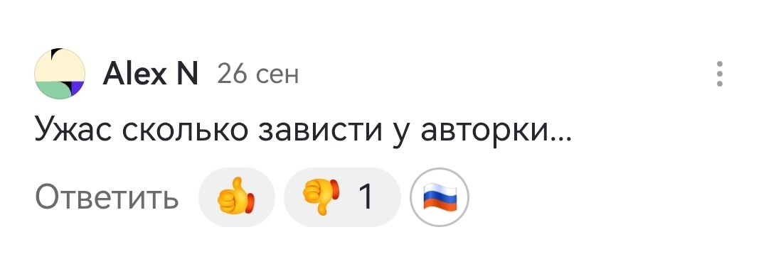Отвечать лично, с возмущением вопрошая, где ж ты, мил человек, дурилка картонная, зависть-то увидел?!, было лень. Да и смысл?... Поэтому решила написать развёрнуто, по пунктам, к чему и сколько у авторки есть этой самой зависти.