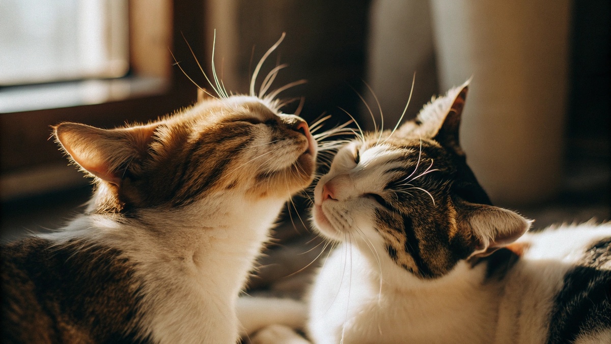 Когда кошки трутся мордами друг о друга, происходит нечто важное - смешение индивидуальных ароматов. Железы на щеках и лбу выделяют феромоны, которые создают общий "семейный" запах.