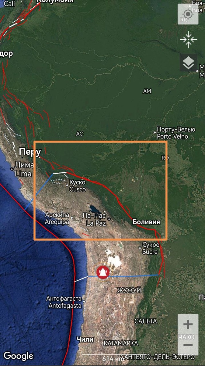 Восток плиты Альтиплано также в зоне риска М6+ находится