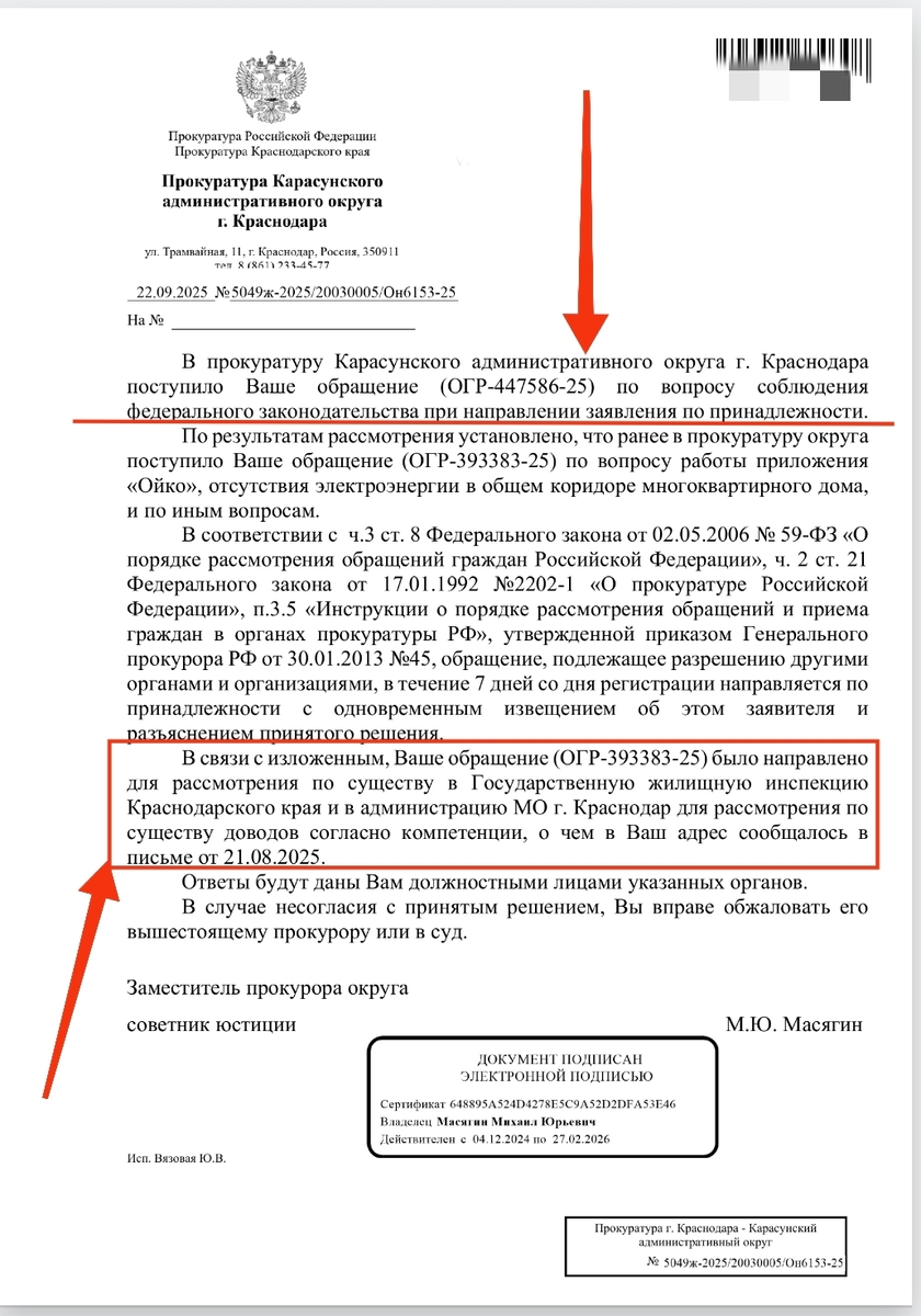 В указанном ответе сообщается, что моё предыдущее обращение (ОГР-393383-25) по вопросам работы приложения «Ойко», отсутствия электроэнергии в общем коридоре многоквартирного дома было направлено для рассмотрения «по принадлежности» в Государственную жилищную инспекцию (ГЖИ) Краснодарского края и администрацию муниципального образования г. Краснодар.