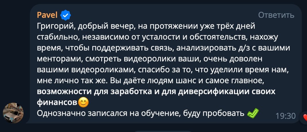 Попасть в клуб, как и говорил нельзя. Он только для ребят из Академии. Но в четверг абсолютно для всех вышел последний, четвертый урок на бесплатном мини обучении. Там ровно тот же подход: максимум пользы для вас. - 5.000 человек его посмотрело. - Всем были выданы доп. практические уроки по наклонкам, про которые я даже не писал в этом канале. - А также домашние задания, которые проверялись нашими кураторами из Академии. Сообщения на скринах все говорят сами за себя, спасибо 🤝 » Смотреть уроки И уже на следующей неделе зайти в канал с уроками будет нельзя, чтобы его посмотрели только те, кому это реально нужно.