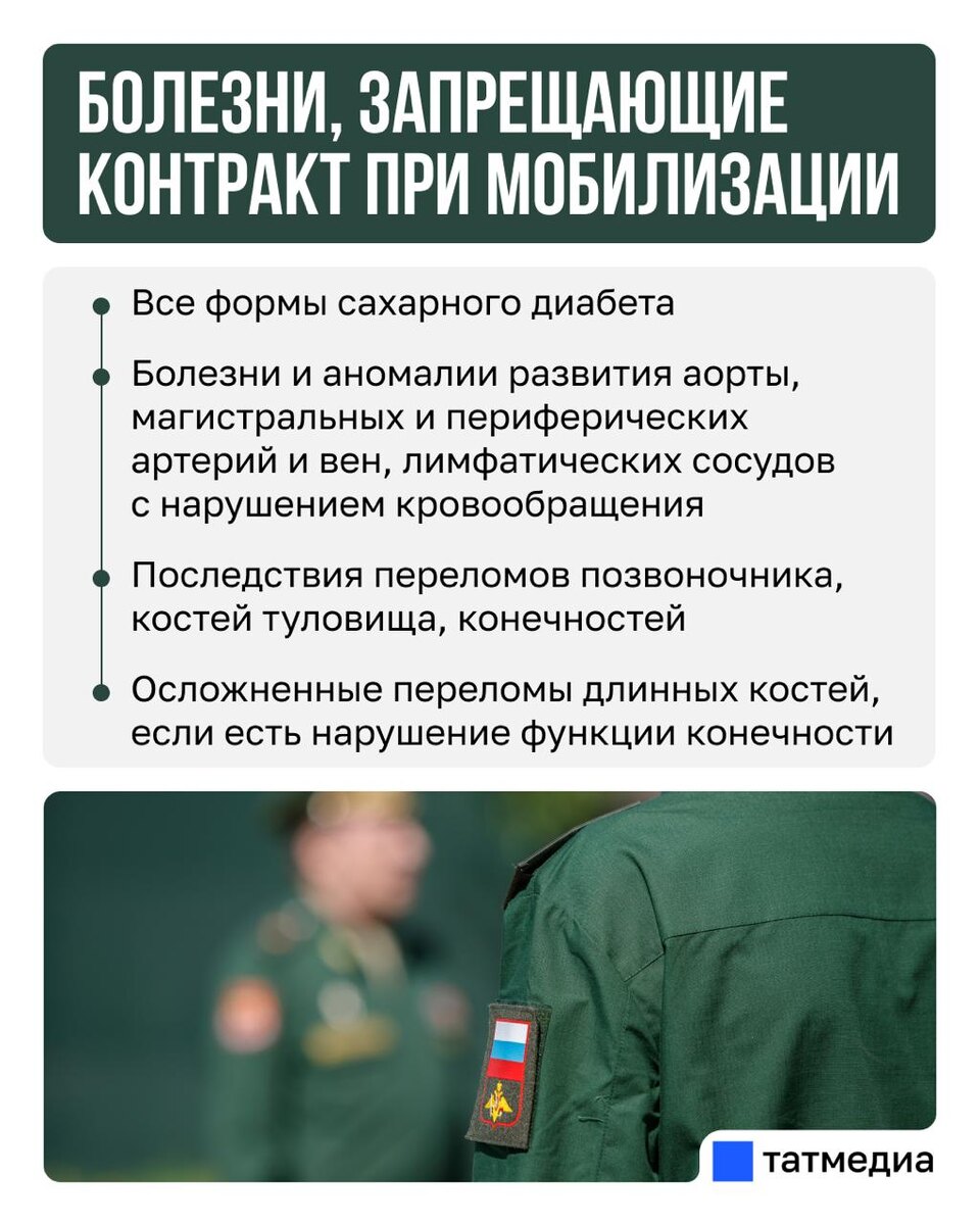 В ответ на пост 🪖👨⚕️ Минобороны расширило перечень болезней, запрещающих контракт при мобилизации Документ опубликован на официальном портале правовых актов. Согласно проекту, перечень болезней расширяется с 26 до 35. @tatmediaofficial | Все каналы Татмедиа ™️ 1-й новостной MAX-канал Татарстана - подпишитесь.