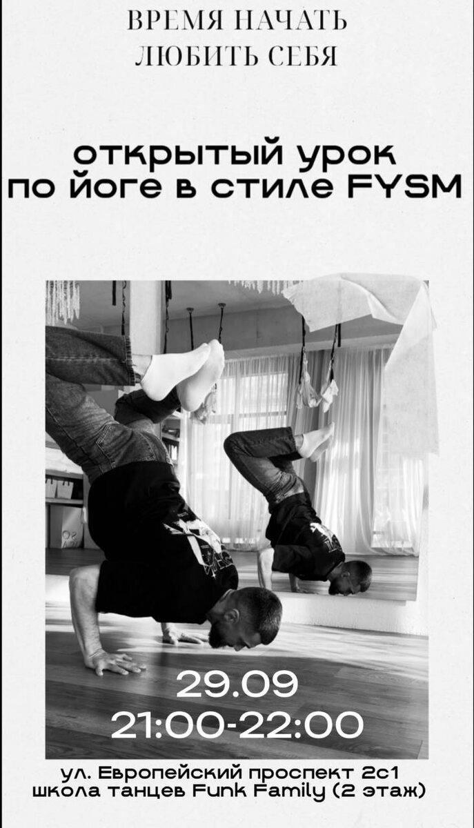 29.09 21:00-22:00 ул. Европейский проспект 2с1 FYSM - это современная йога для современного человека. Йога для тех кто хочет все сразу. Эффективная Безопасная Простая Уровень подготовки - любой.( даде если вы никогда не занимались йогой) Вход свободный. Кол-во мест ограничено! Запись @vadimm_sever