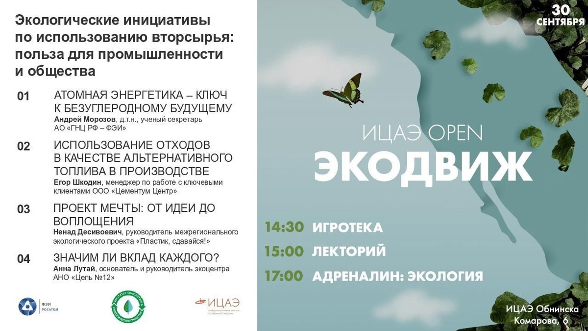 30 сентября с 14:30 в ИЦАЭ пройдёт «Экодвиж». Что такое зелёная энергетика? Какие экологические инициативы реализуются в Калужской области? Как каждый из нас может помочь окружающей среде? Об этом и многом другом смогут узнать посетители мероприятия. 🎓 Для кого: школьников 5-11 классов (особенно довольны останутся те, кто заинтересован в проектной деятельности). ❗Но интересно будет не только школьникам. ✅14:30 Игротека ✅15:00 Лекторий ✅17:00 Квиз «Адреналин: экология» Ключевым событием станет серия лекций на тему экологических инициатив: 🗣Ненад Десивоевич, руководитель межрегионального экологического проекта «Пластик, сдавайся! Обустройство территорий изделиями из вторсырья», прочитает лекцию на тему «Проект мечты: от идеи до воплощения»; 🗣Анна Лутай, основатель и руководитель экоцентра «ЦЕЛЬ N12», поговорит с участниками о значимости вклада каждого человека в экологию, силе маленьких шагов, индивидуальных усилиях и национальных проектах; 🗣Егор Шкодин, менеджер по работе с ключе