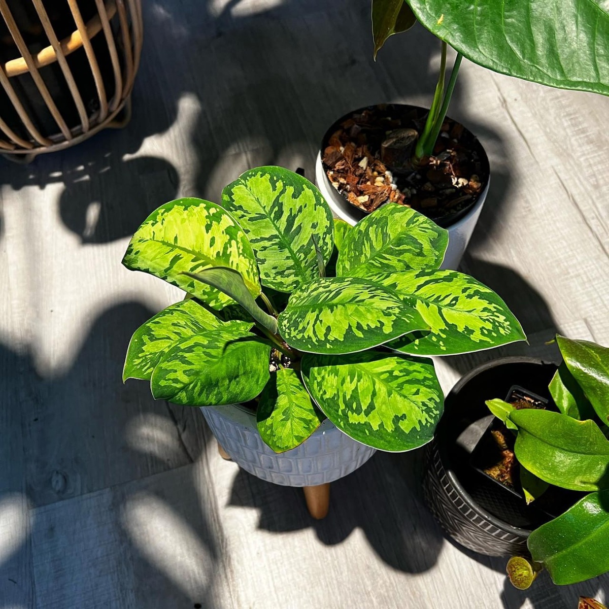🌿 Хомаломена — экзотическое растение семейства ароидных с крупными сердцевидными листьями насыщенного зелёного цвета, часто с серебристыми или пёстрыми узорами (в зависимости от вида и сорта), которые создают эффект уюта и добавляют глубину интерьеру. Оно идеально подходит для создания уютных зелёных зон в современных пространствах. Хомаломена предпочитает рассеянный свет (избегайте прямого полуденного солнца), высокую влажность, тепло и умеренный полив с просыханием верхнего слоя почвы. Это растение отлично смотрится в горшках на полках, столах или в групповых композициях, привнося тропический шарм и свежесть в домашний декор.
