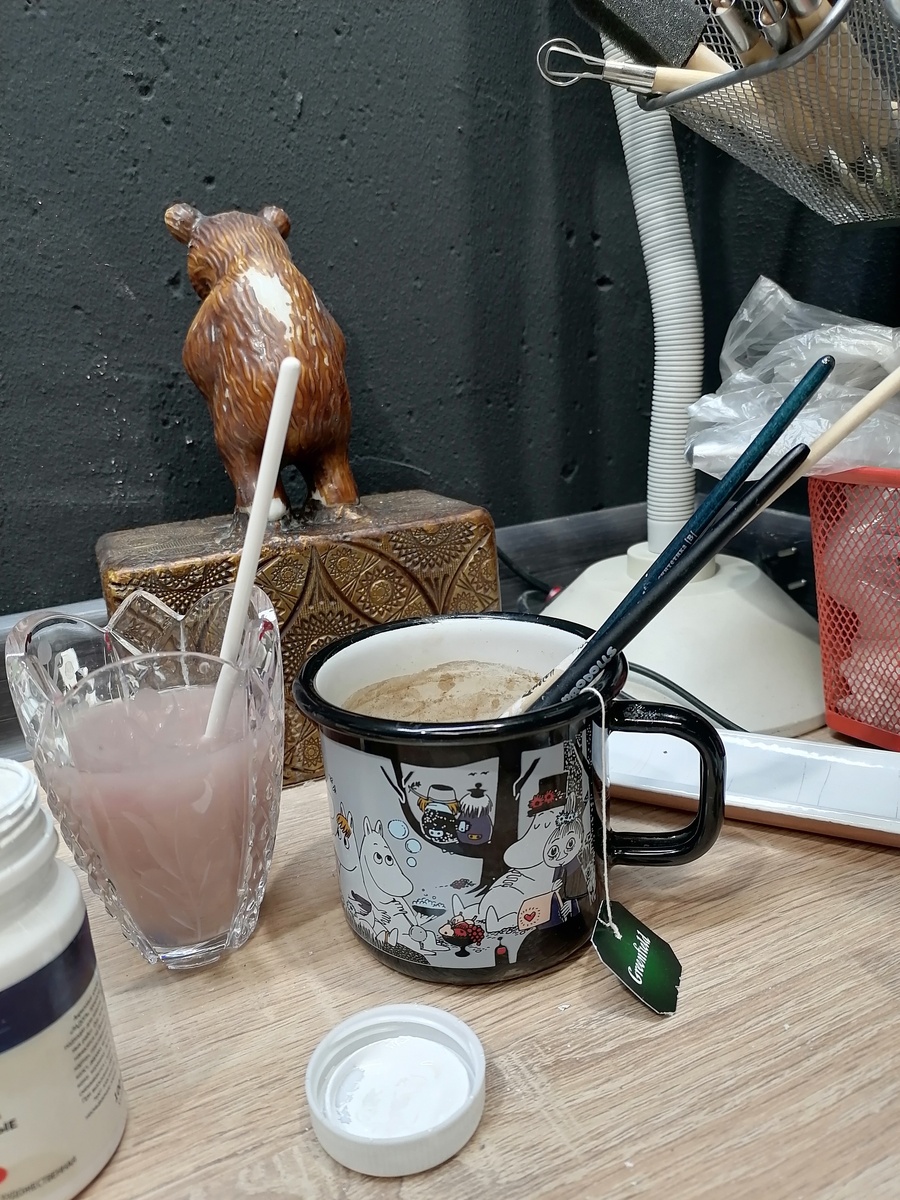 Знакомая всем ситуация. Прополоскать кисточки в кружке с чаем! Поскольку я являюсь жутким водохлебом - кружка (кружки) путешествуют за мной везде. С кухни в комнату, со стола на тумбочку. Работа же без чаечка-кофеечка вообще не работа. Но рисовать одновременно с распитием напитков я перестала :) Нет, медведь не наказан. Он сохнет!