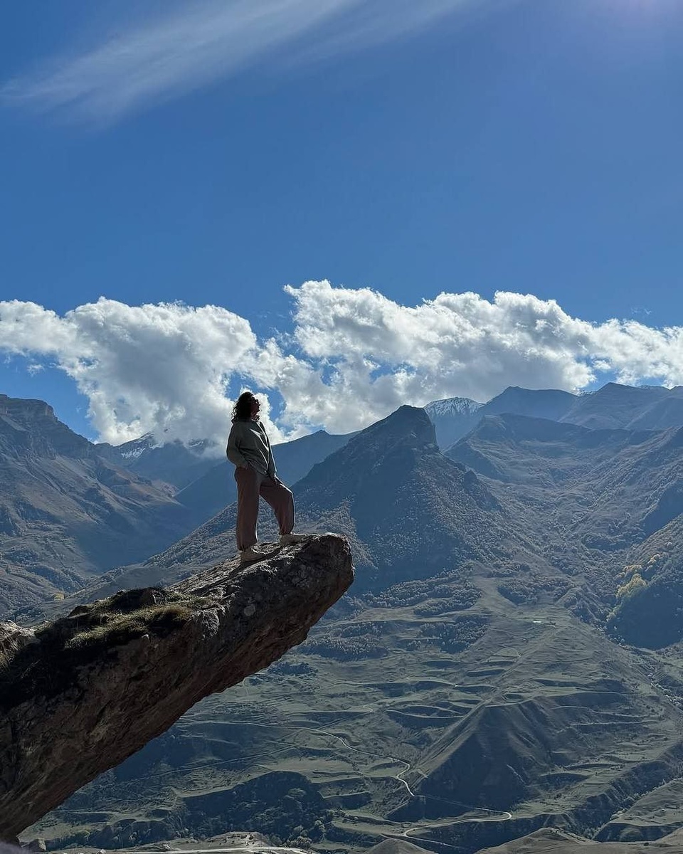 Смотровая площадка над облаками 🏔 Безенгийский «Язык Тролля». В Безенгийском ущелье Кабардино- Балкарии находится каменный выступ длиной 3 метра — местный «Язык Тролля». Это творение тектонических сил стало идеальной смотровой площадкой на высоте. 💦 Открывается панорама «малых Гималаев» — вид на Безенгийскую стену с пятитысячниками. Здесь же крупнейший ледник России — Безенгийский ледник, водопады, каскады, исторические руины Верхний Хулам. 📷 barbarisker ⛏ Юг Край