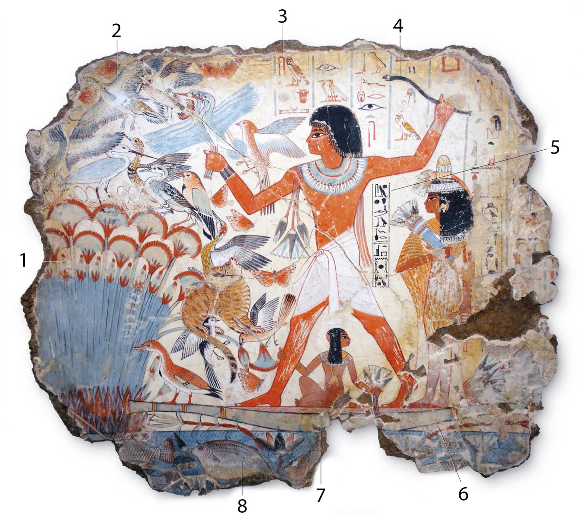 Небамун, важный "писец и счётчик зерна" фараона Аменхотепа III, заказал эту фреску для украшения своей гробницы на западном берегу Нила. Согласно иероглифической подписи, на ней изображен Небамун, "наслаждающийся собой и видящий красоту" в загробной жизни. Она была создана, чтобы побудить его семью и друзей посетить гробницу и поговорить о нём, гарантируя ему благополучную загробную жизнь. Большая фигура Небамун доминирует на этой яркой картине. Его решительная поза демонстрирует силу, мощь и динамизм. 1. Заросли папируса, птицы, бабочка и кот – все это реалистично изображено. 2. Птицы словно вырываются из земли, символизируя жизненную силу и изобилие природы. Однако они также являются злыми духами, которых Небамун изгоняет. 3. Божественные символы на заднем плане указывают на то, что боги заботятся о душе Небамуна. 4. Змеевидная палка в руке Небамуна часто использовалась на охоте. 5. Иероглифическая подпись поясняет картину зрителю. 6. Лодка типична для этой болотистой местности, но