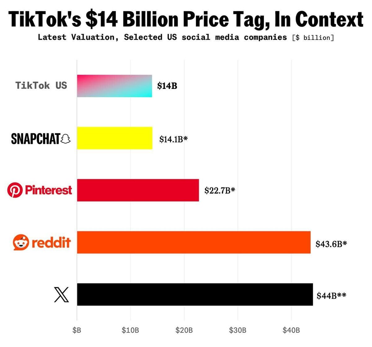 А еще забавная картинка. Вот небольшая инфографика о стоимости продажи разных приложений. Мы писали о том, что это исключительная победа Трампа и это действительно так. Напомним, что цена продажи всего $14 млрд — это дешевле Snapchat и Pinterest. Это в три раза дешевле, Reddit и X. Это тот случай, когда социальная сеть досталась можно сказать бесплатно. @lobushkin