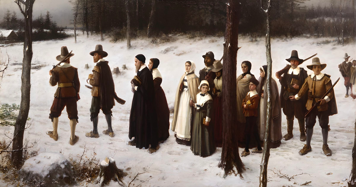 Преследуемые на родине, в 1620 году пуритане отплыли на корабле «Мэйфлауэр» и основали в Северной Америке колонию Новая Англия. Их лидер Джон Уинтроп провозгласил идею «Града на холме» — образцового общества, которое будет светить всему миру. Эта метафора позже стала краеугольным камнем американской идентичности.