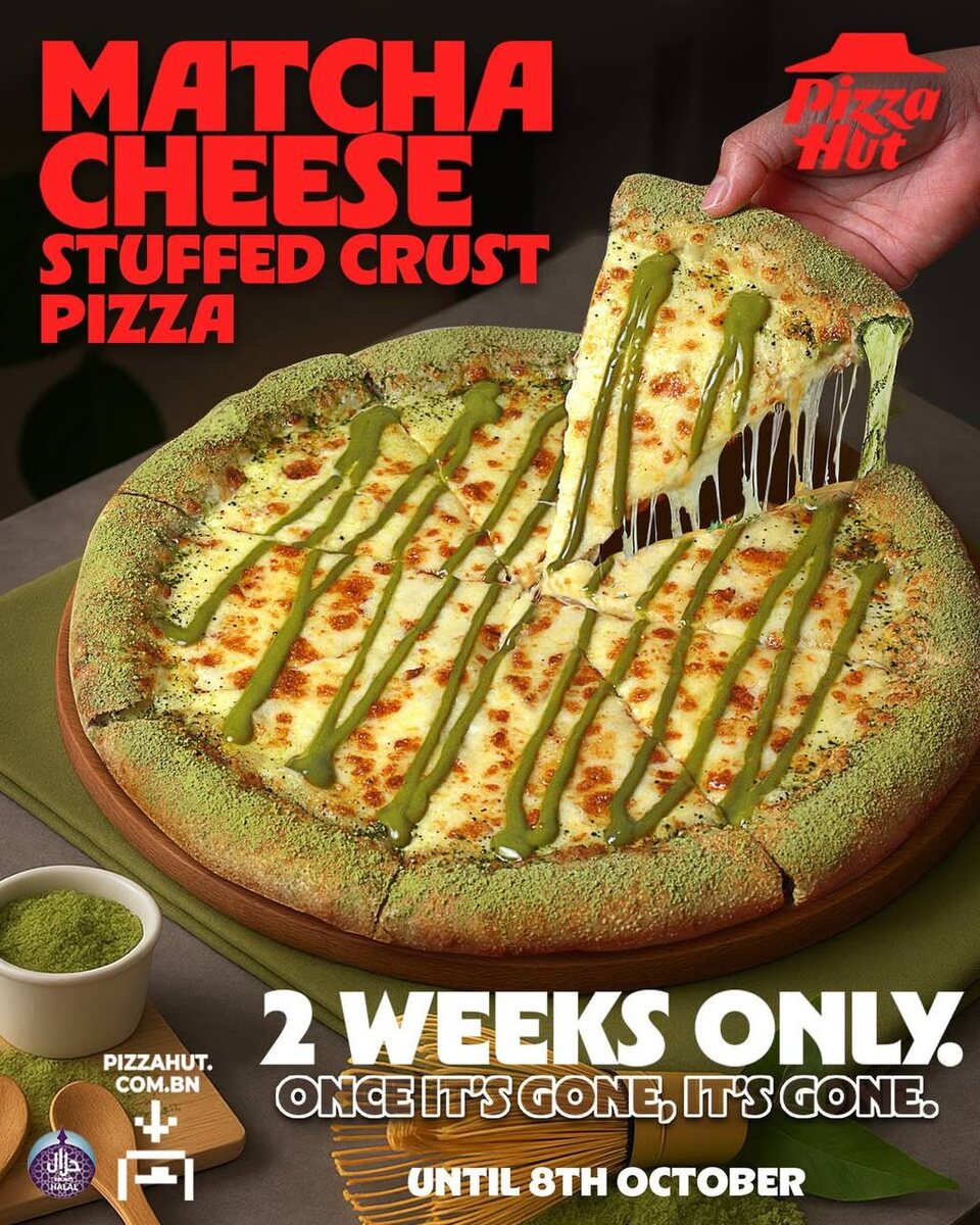 ЛОЛ, МАТЧА-пиццу выкатил брунейский Pizza Hut. Это лимитка, которая будет доступна всего 2 недели — до 8 октября. По сути, это сырная пицца с сырными бортиками, с добавлением матча-соуса и присыпанная матчей. Ура, еда для бодрости 🍕