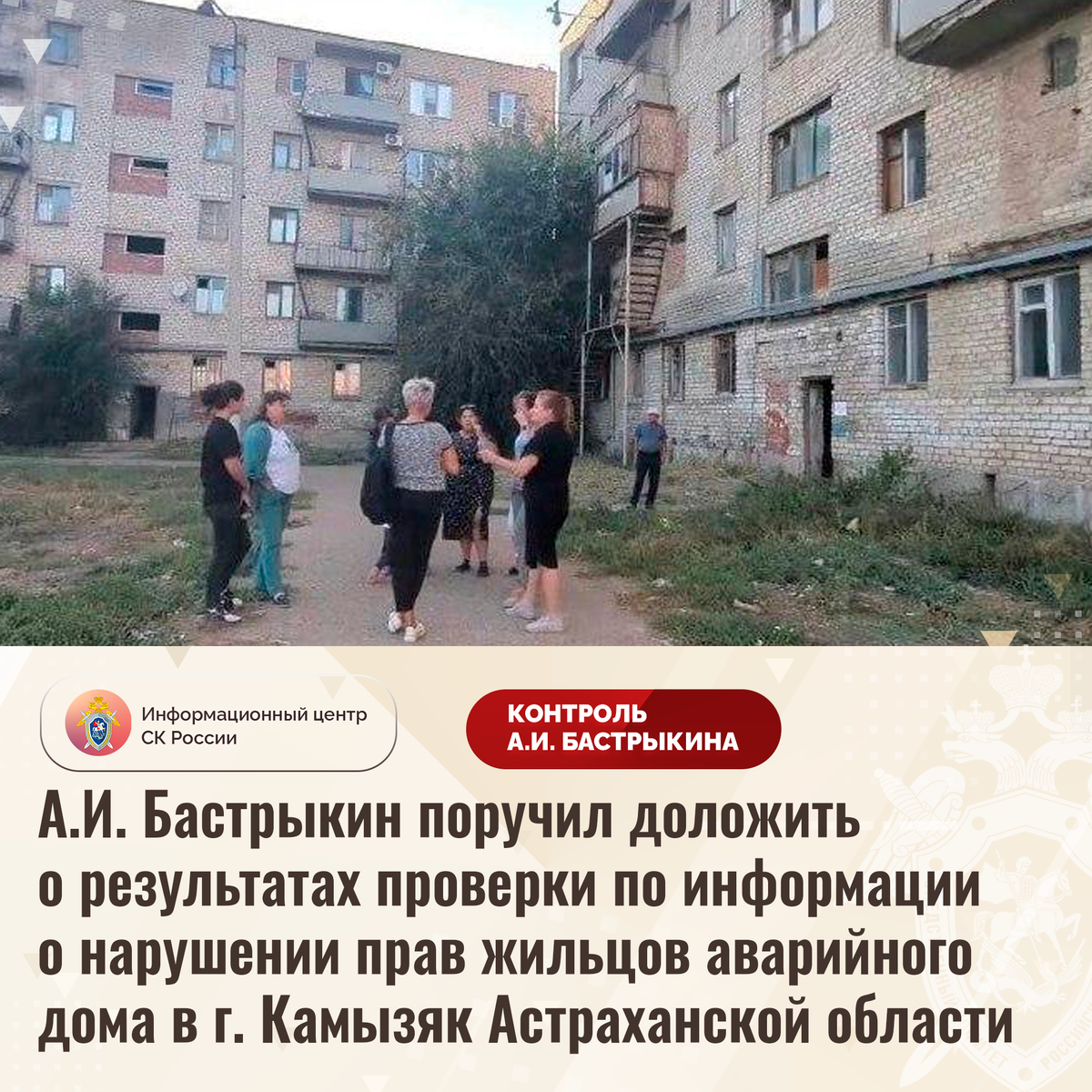 А.И. Бастрыкин поручил доложить о результатах проверки по информации о нарушении прав жильцов аварийного дома в г. Камызяк Астраханской области В социальной сети сообщается о нарушении прав жильцов многоквартирного дома на улице Максима Горького в городе Камызяк Астраханской области. Здание 1985 года постройки находится в непригодном состоянии: фасад и конструкции разрушаются, перекрытия первого этажа деформированы, в помещениях образовались сырость и плесень. В связи со значительным физическим износом в 2020 году строение признано аварийным, однако срок расселения, изначально установленный на 2022 год, постоянно переносится. При этом граждан уведомляют об отключении их дома от коммуникаций. Многочисленные обращения в различные инстанции результатов не принесли. В СУ СК России по Астраханской области по данному факту организована процессуальная проверка. Председатель Следственного комитета Российской Федерации Александр Иванович Бастрыкин поручил и.о. руководителя СУ СК России по Астр