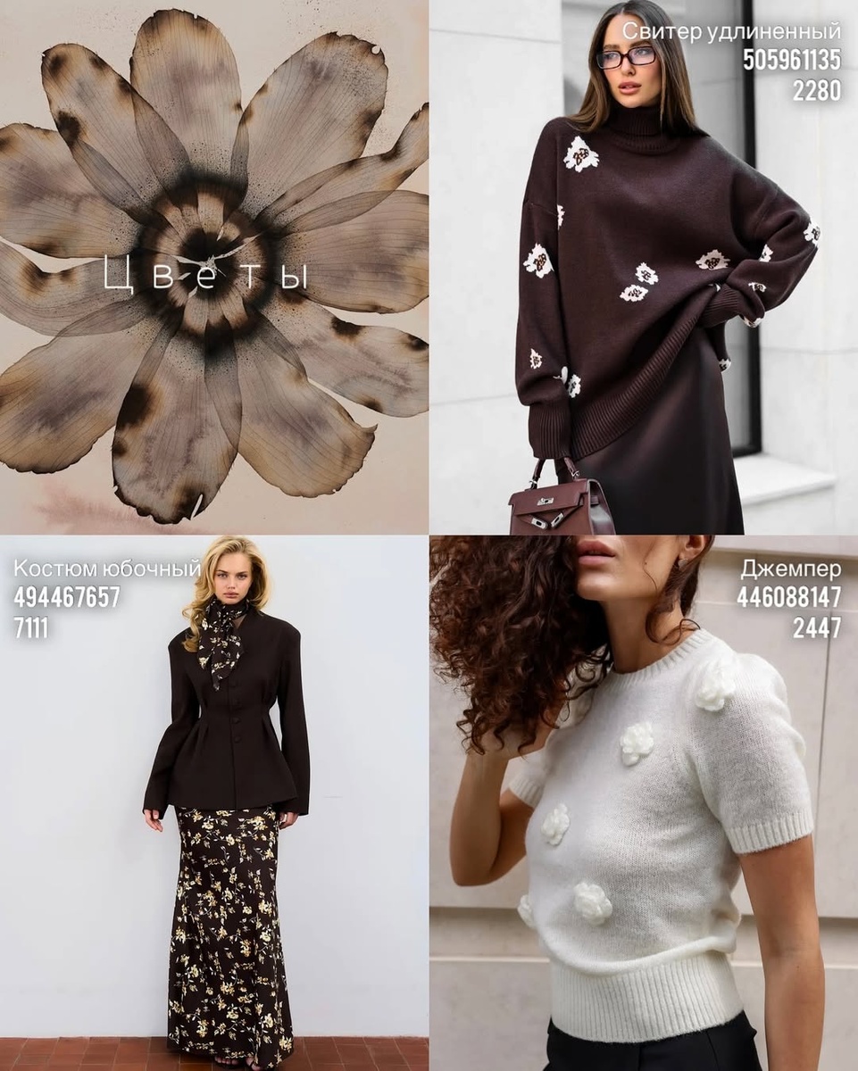 Цветочный мотив умеет быть не только романтичным, но и современным. В этой подборке — три вещи в выверенной палитре «горький шоколад и светлые сливки». Они легко сочетаются друг с другом и создают мини-капсулу на каждый день. Ниже — подробный разбор строго по порядку с артикулами, нюансы кроя и советы стилиста. Что это за модель. Объёмный свитер в оттенке горького шоколада с высоким мягким воротом. Плечо спущено, рукав длинный с широкими манжетами. Низ оформлен плотной резинкой и чуть удлинён — край ложится красивой волной. Контрастные цветы расположены группами по переду и рукавам: это не «детскость», а графичный акцент, который оживляет темную плоскость. Как сидит. Свободная посадка прячет верхнюю зону, делает силуэт хрупким. Высокий ворот вытягивает линию шеи, а тёмный цвет визуально стройнит. Длина позволяет носить свитер как самостоятельный верх с узкими низами, так и заправлять переднюю часть для обозначения талии. С чем носить. Совет стилиста. Если вы миниатюрного роста, обозн