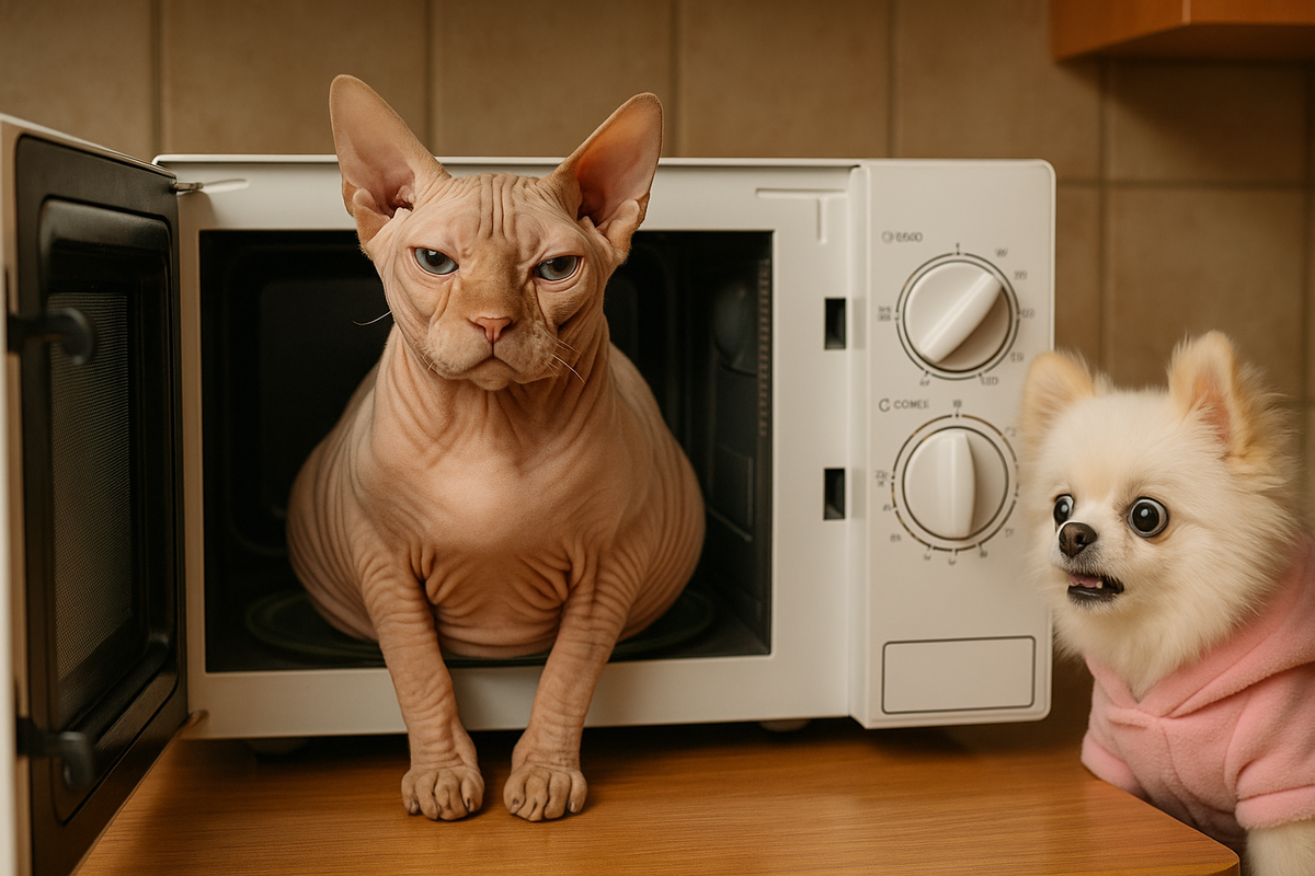 Потом вылез из пледа, гордо обнажил своё великолепие, похожее на варёного сфинкса из музея анатомии, и ушёл — не в сторону подоконника, а прямо к микроволновке. Проверил, закрыта ли. Проверил розетку. Проверил, смотрим ли мы.