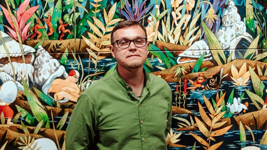 Московская галерея Artstory открыла осенний сезон выставкой художника Евгения Родионова «Мы идем на водоем». Постоянные зрители галереи помнят его персональную выставку «Чудолесье», прошедшую здесь три года назад. К тому времени за плечами вологодского художника уже были проекты и в Москве, и в Петербурге, но именно в 2022-м он заявил о себе на широкую аудиторию. И показал, как создать вселенную в наивно-лубочном стиле: населить ее персонажами — прежде всего колоритными бабушками, добавить тексты в философско-концептуалистском духе — и получить удивительный мир Чудолесья. Кто-то решит, что это отсылка к райскому саду — то есть утраченному идеалу. Но сам автор предпочитает говорить о заповеднике — не исчезнувшем, но сохранившемся в своем естественном виде. Евгений Родионов. Фото: Дмитрий Чунтул/предоставлено пресс-службой галереи Artstory