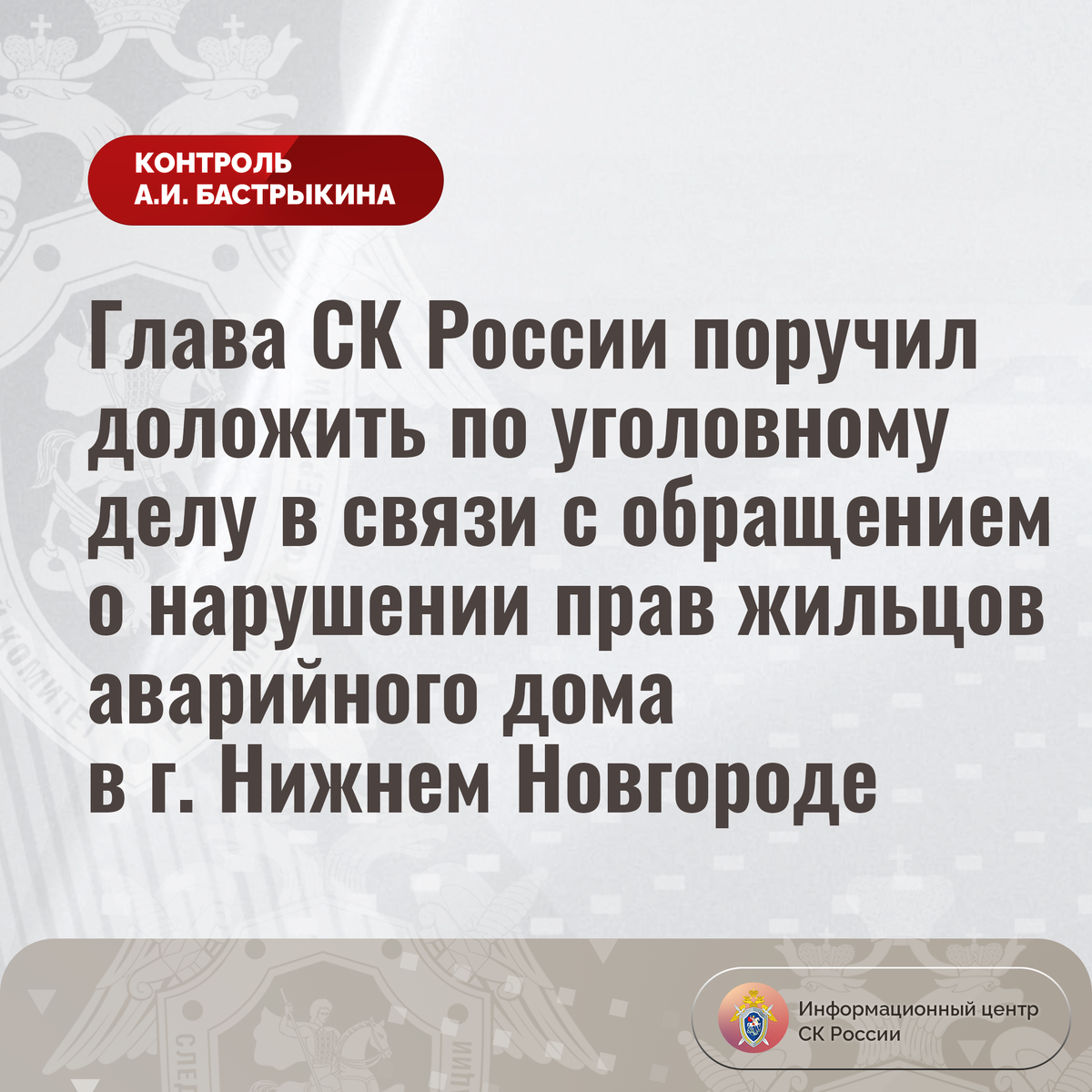 Глава СК России поручил доложить по уголовному делу в связи с обращением о нарушении прав жильцов аварийного дома в г. Нижнем Новгороде