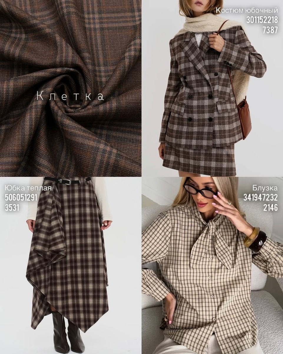 Клетка — вечная классика, которая не устает удивлять. В теплой коричневой гамме она выглядит особенно благородно: мягко окутывает, добавляет фактуры и сразу собирает образ. На фото — три вещи, с которыми легко построить мини-капсулу на осень и зиму: строгий костюм, тёплая юбка с эффектным подолом и блузка с бантом. Разбираю каждую модель строго по порядку артикулов, с нюансами кроя, посадки и практичными советами стилиста. Что это за модель. Классический двубортный жакет на подкладке с ровными плечами и четкими лацканами. Посадка полуприлегающая, силуэт собранный: линия плеча аккуратная, рукав полной длины с декоративными пуговицами. Карманы с клапанами добавляют «деловитости», а двубортность визуально выстраивает вертикаль. Юбка — прямая, мини, на поясе; длина открывает верх голени — самая стройнящая зона. Рисунок клетки — сложный, многотоновый: шоколад, мокко, молочные нити — благодаря этому костюм выглядит дороже однотонного. Как сидит. Жакет формирует правильные пропорции «песочны
