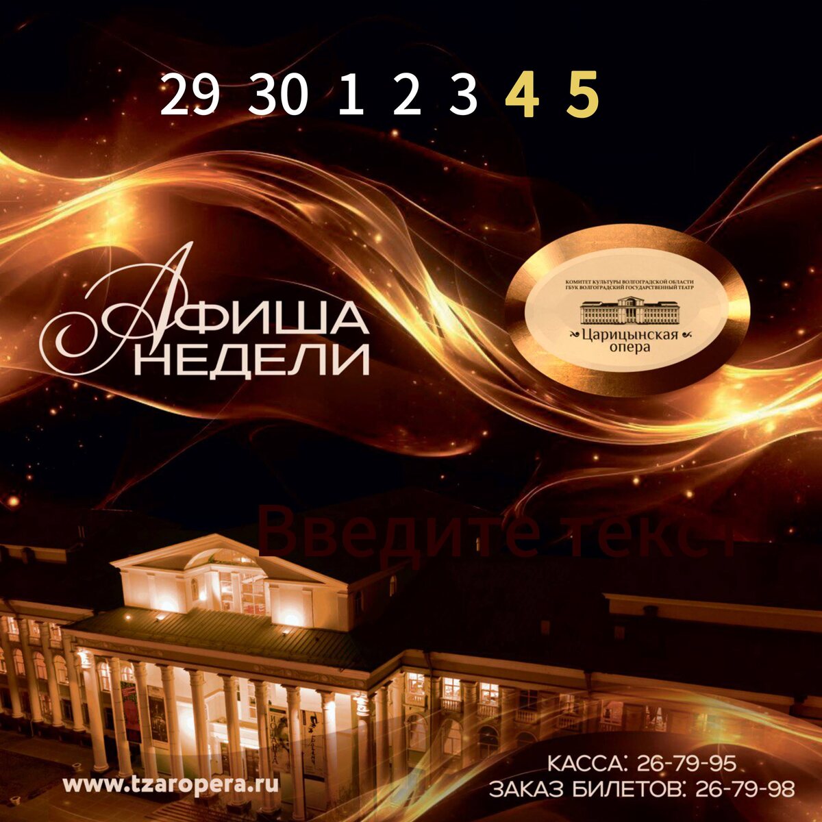 Афиша недели 29 сентября - 5 октября Начинаем новый месяц осени, новым проектом. 4 и 5 октября в театре «Царицынская опера» состоится премьера нового музыкально-хореографического перформанса «Песни Земли». Автор идеи, режиссёр, балетмейстер-постановщик Александр Зверев, дирижёр-постановщик Сергей Гринев. «Песни Земли» — это не просто концерт, а многослойное художественное произведение, с объединяющей сюжетной линией, которая связывает воедино музыкальные и хореографические номера. Билеты: https://clk.li/iFZg