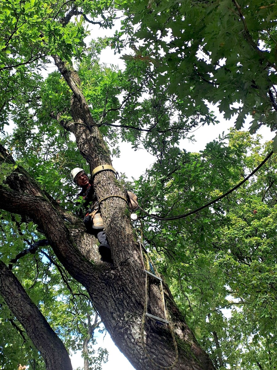 Система представляет собой высокопрочные эластичные канаты, которые адаптируются к индивидуальной форме дерева и не мешают его росту. Это решение снижает риск обломов ветвей и продлевает жизнь деревьям, сохраняя исторический облик сквера.