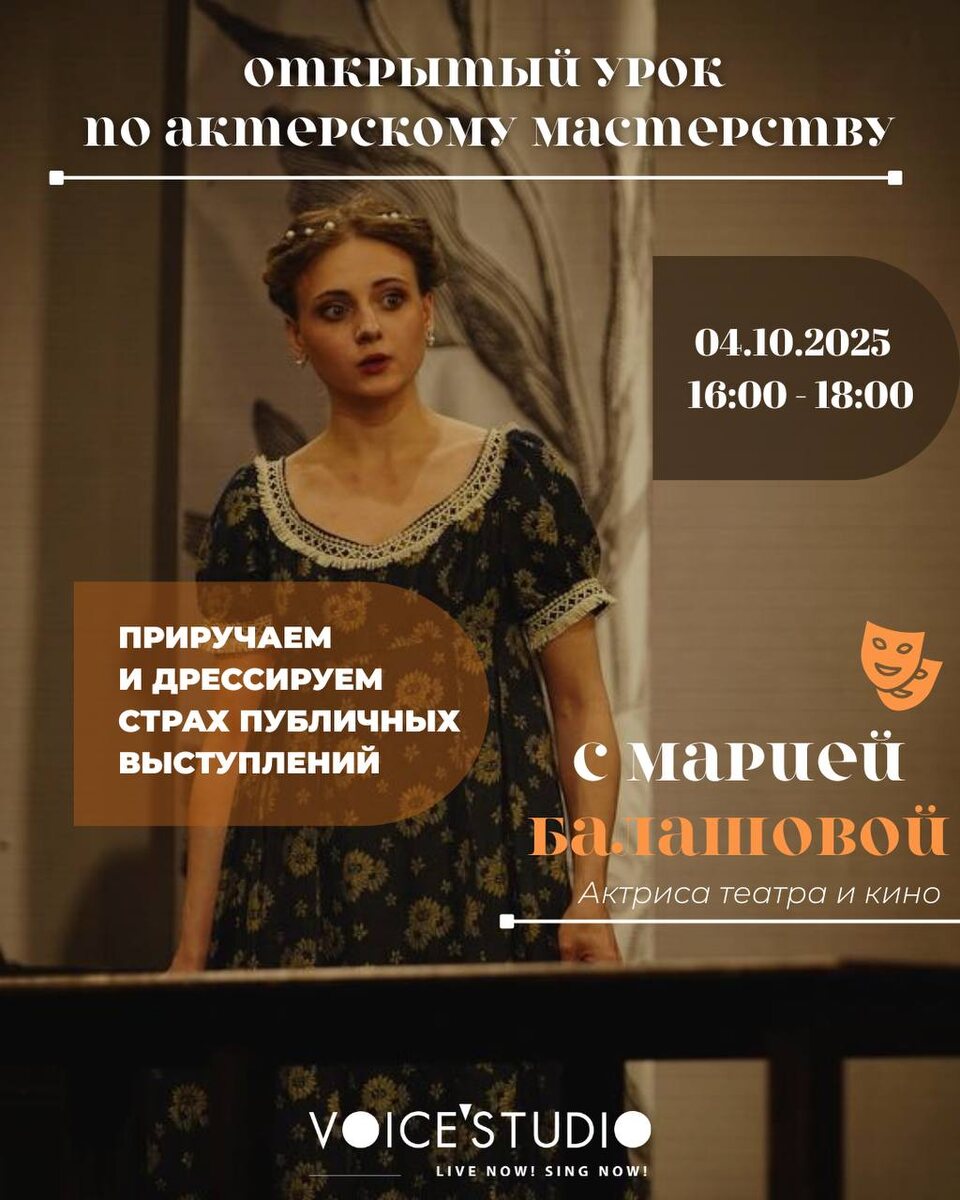 Откройте свой голос и уверенность. Знакомо ли это чувство, когда нужно заговорить — на встрече, перед коллегами или даже в компании друзей… и вдруг внутри всё сжимается. Голос предаёт, мысли путаются, и единственное желание поскорее «спрятаться». На открытом занятии с Балашовой Марией по актёрскому мастерству вы попробуете превратить волнение в энергию и научитесь чувствовать себя свободно там, где раньше было страшно. Что ждёт на уроке: ▪️как звучать уверенно — на сцене, в переговорной или даже поднимая бокал на семейном ужине; ▪️практические упражнения для голоса и дикции — вас будет приятно слушать и невозможно перебить; ▪️лёгкость и свобода, которые выходят далеко за рамки сцены и делают проще каждое новое общение. ▫️Иногда достаточно небольшого опыта, чтобы привычный страх перестал держать внутри и превратился в силу. 🤍Попробуйте и ваш голос зазвучит так, что вас услышат