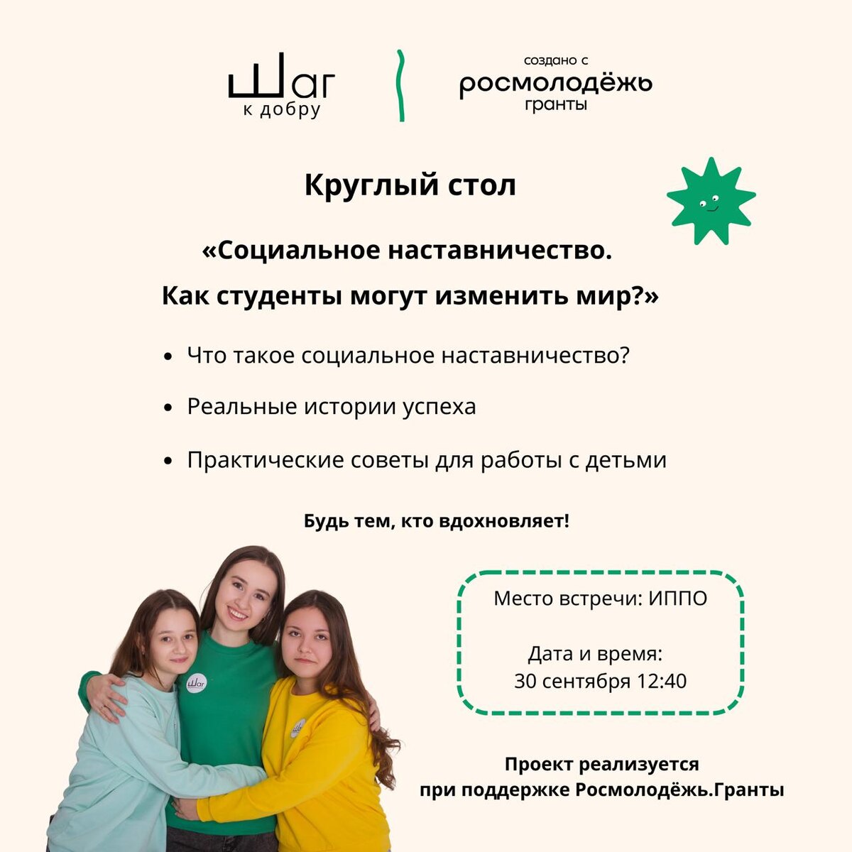 Мы запускаем проект «ШАГ к добру»! 🚀 20 студентов педагогических ВУЗов пройдут школу социального наставничества и станут наставниками для 60 школьников. Вместе мы будем развивать у подростков уверенность, креативность и гибкие навыки, которые помогут им в учёбе и жизни. Уже в этот вторник мы проведем круглый стол, на котором обсудим: — что такое социальное наставничество и какова его роль? — как помочь школьникам в развивитии гибких навыков? — реальные истории успеха и советы от практиков Присоединяйтесь! г. Москва, Столярный переулок, д.16 стр.1 #Росмолодёжь #РосмолодёжьГранты
