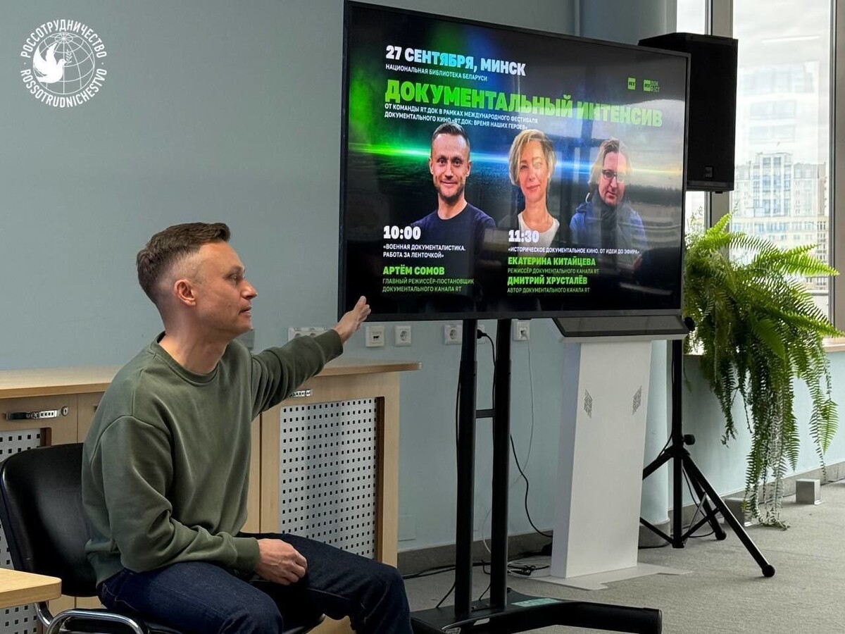 Впервые в столице Республики Беларусь 27 сентября в Национальной библиотеке Беларуси режиссёры и авторы RT.Док Артём Сомов, Екатерина Китайцева и Дмитрий Хрусталев провели мастер-классы по военной и исторической документалистике. Об этом сообщается в официальном MAX-канале RT. Интенсив начался с мастер-класса «Военная документалистика. Работа за ленточкой», который провел главный режиссёр-постановщик документального канала RT Артём Сомов. Он работает на канале RT c момента его основания в 2005 году. Им снято несколько десятков фильмов, он объездил более 40 стран. С 2022 снимает фильмы на передовой в зоне проведения СВО. В 2025 году его лента «Я живой» получила главный приз на Международном фестивале «Сопротивление» в Иране. Документалист рассказал о жанрах документального кино, а также – об особенностях работы в зоне проведения СВО. Он поделился секретами мастерства, рассказав участникам, как погрузить зрителя в атмосферу происходящего, а также какую аппаратуру нужно взять с собой на с
