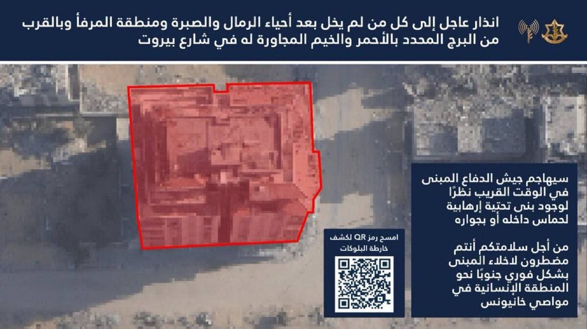 Пресс-служба ЦАХАЛя а арабском языке предупреждает о сносе еще одной башни в Газе.