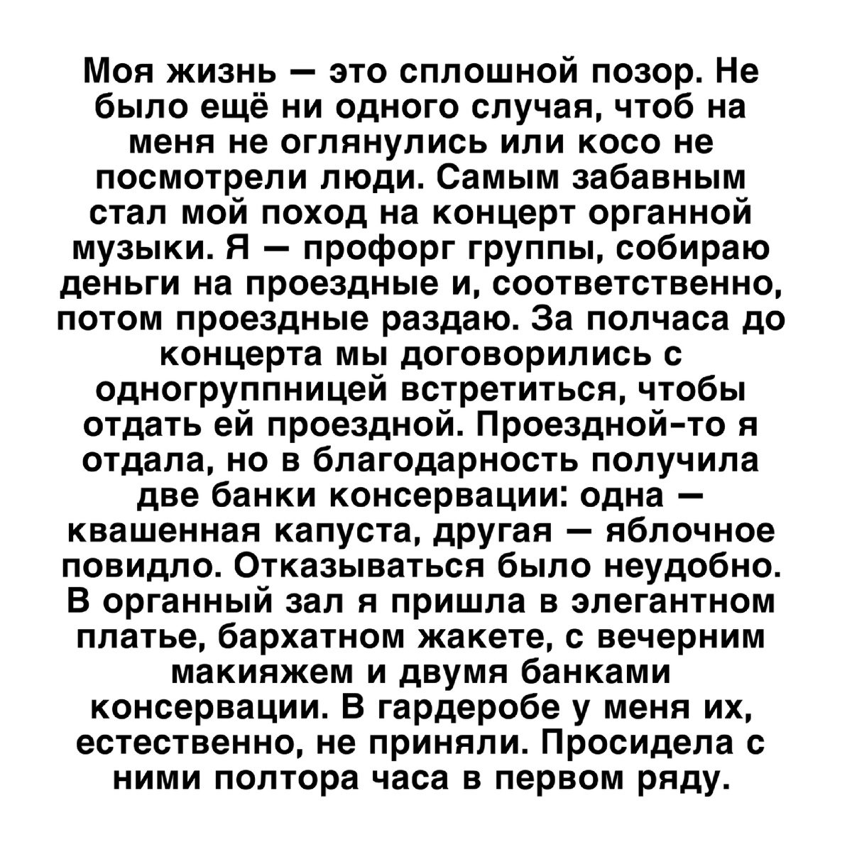 Моя жизнь — это сплошной позор. Не было ещё ни одного случая, чтоб на меня не оглянулись или косо не посмотрели люди. Самым забавным стал мой поход на концерт органной музыки. Я — профорг группы, собираю деньги на проездные и, соответственно, потом проездные раздаю. За полчаса до концерта мы договорились с одногруппницей встретиться, чтобы отдать ей проездной. Проездной-то я отдала, но в благодарность получила две банки консервации: одна — квашенная капуста, другая — яблочное повидло. Отказываться было неудобно. В органный зал я пришла в элегантном платье, бархатном жакете, с вечерним макияжем и двумя банками консервации. В гардеробе у меня их, естественно, не приняли. Просидела с ними полтора часа в первом ряду.