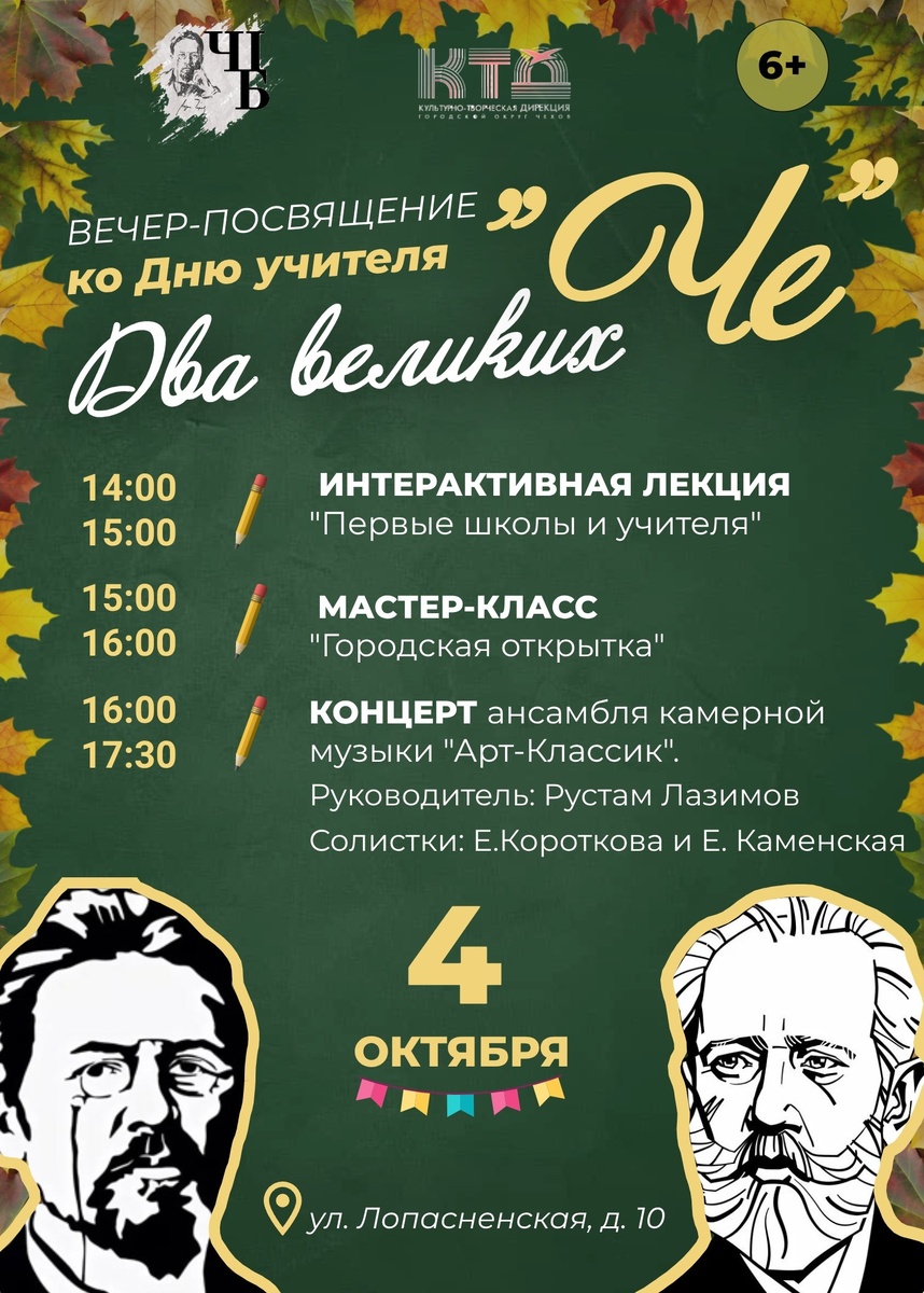 ✨ Центральная библиотека приглашает отметить День учителя на вечере-посвящении «Два великих "Че"», посвящённом творчеству А.П. Чехова и П.И. Чайковского. Программа включает интерактивную лекцию о первых школах и учителях, мастер-класс по созданию городской открытки и концерт ансамбля камерной музыки «Арт Классик». Мероприятие пройдёт 4 октября по следующему расписанию: - 14:00–15:00: интерактивная лекция «Первые школы и учителя» - 15:00–16:00: мастер-класс «Городская открытка» - 16:00–17:30: концерт ансамбля камерной музыки «Арт Классик» под руководством Рустама Лазимова с участием солисток Елены Каменской и Елены Коротковой. 👉 Прислать новость 💥 Проект "Чехов Детям"