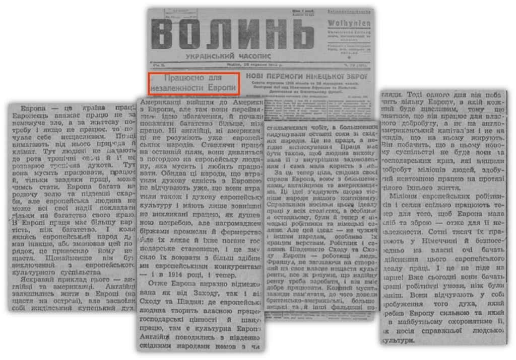 Оккупационная газета “Волинь” № 73 от 20 сентября 1942 года разъясняет украинцам, что Европа – это край труда, где каждый европеец признает труд жизненной необходимостью. На востоке большевики якобы выжимали последние народные соки. И вот за это получили – с ним воюет Европа. В общем, вы, наверное, уже поняли главный посыл публикации. Это призыв работать на независимость Европы (тогда – нацистской Германии) украинских читателей данной газеты. У меня вопрос: если раньше работа на европейских хозяев направлена была на независимость Европы, то почему сейчас она называется независимостью Украины? Это поневолення України! Ваша Дана