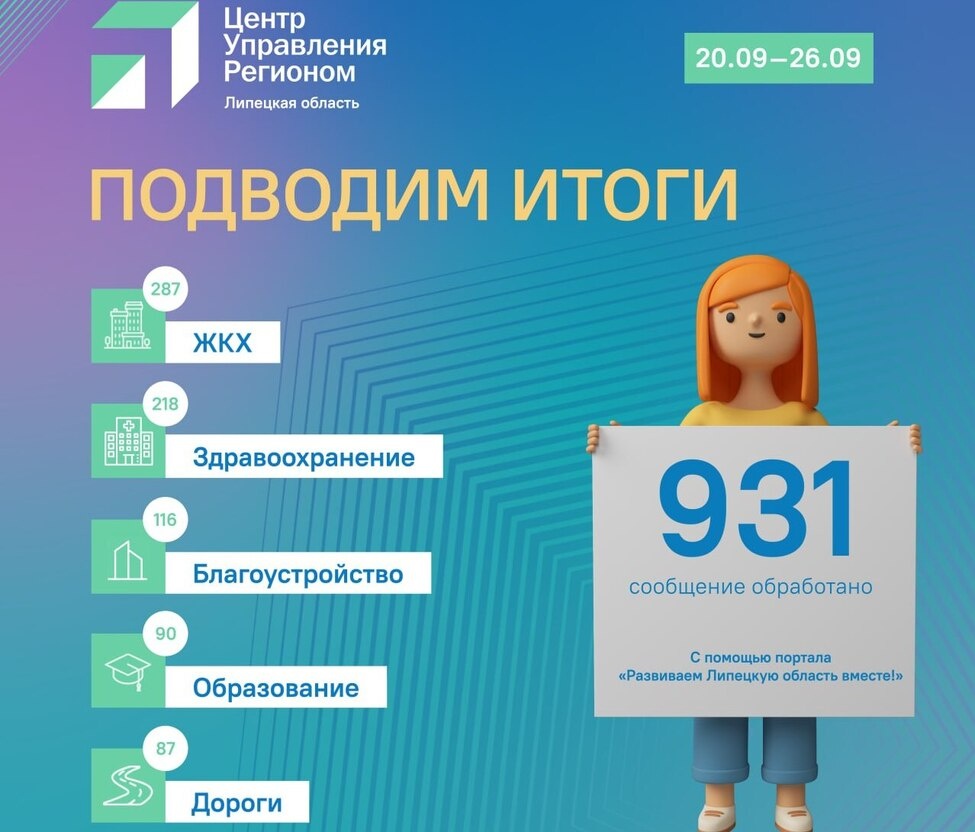 Центр управления регионом подвел итоги работы за неделю, с 20 по 26 сентября. На портал «Развиваем Липецкую область вместе!» за этот период поступило 931 сообщение. Через систему «Инцидент Менеджмент» специалисты обработали 675 обращений. По статистике. Представленной ЦУР Липецкой области, чаще всего в соцсетях жители жаловались на проблемы в ЖКХ: отсутствие горячей и холодной воды. На втором месте по количеству обращений — дороги и некачественный ремонт тротуаров. Замыкает тройку вопросы благоустройства. На портале «Развиваем Липецкую область вместе!» также больше всего жалоб на систему ЖКХ, а именно горячее водоснабжение. После него идет здравоохранение, жители спрашивали про оказание услуг в электронном виде. На третьем месте — благоустройство: липчан волновало отсутствие освещения в общественных местах. Как сообщили в ЦУР, по всем вопросам жители могут обратиться на сайт «Развиваем Липецкую область вместе!» или оставить свои комментарии в соцсетях ведомства.