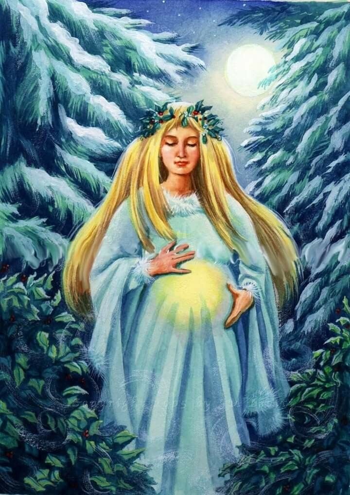 В более мягкой, не-скандинавской традиции, почиталась Богиня-Мать, которая в самую тёмную ночь рожала Солнечного Бога (например, кельтского Луга или скандинавского Бальдра). Это символ надежды и нового начала.