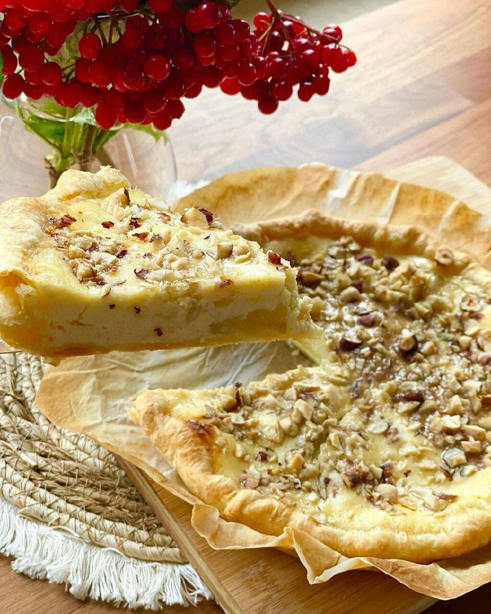 Тарт с грушей 📖 Ингредиенты: - Груша - 2-3 шт. - Яйцо - 2 шт. - Сахар - 60 г. - Ванильный сахар - 1 пакетик (7г) - Рикотта - 250 г. - Слоёное тесто - 200 г. - Орехи - 70 г. 🧑🏻🍳 Приготовление: 1. Тесто раскатать в пласт, выложить в форму диаметром 23-25 см. 2. Груши почистить и нарезать тонкими ломтиками. Выложить ломтики груши на основу. 3. В глубокой миске смешать яйца, рикотту, сахар, ванильный сахар. Вылить сверху на груши. 4. Орехи измельчить и посыпать сверху. 5. Поставить в разогретую духовку до 190° на 30-35 минут. #тарт #тартсгрушей #десерт